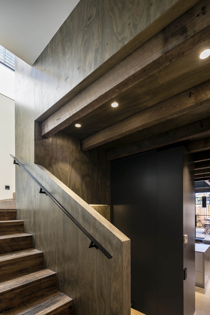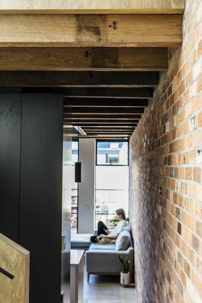 Existing brickwork was retained and re-used for the new portions of the house, with reverse brick veneer providing a beautiful visual feature internally as well as a thermally efficient wall construction to the new living space. Recycled timber beams were incorporated into the structure of the building in response to the client’s love of timber and connection to the timber industry.