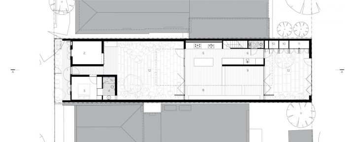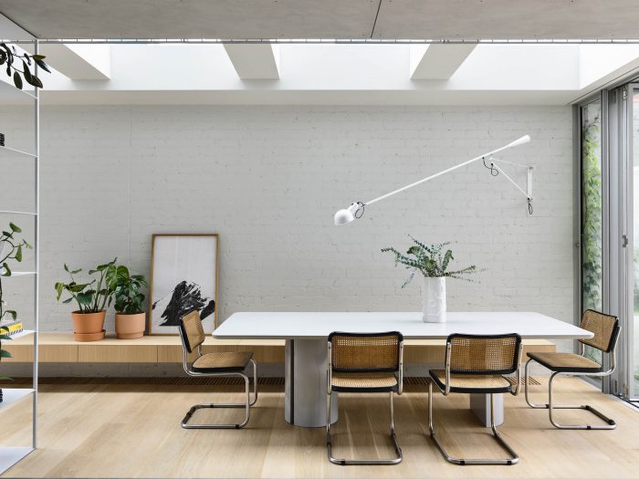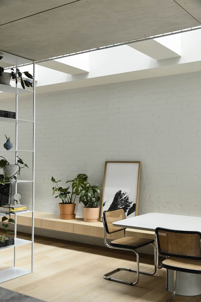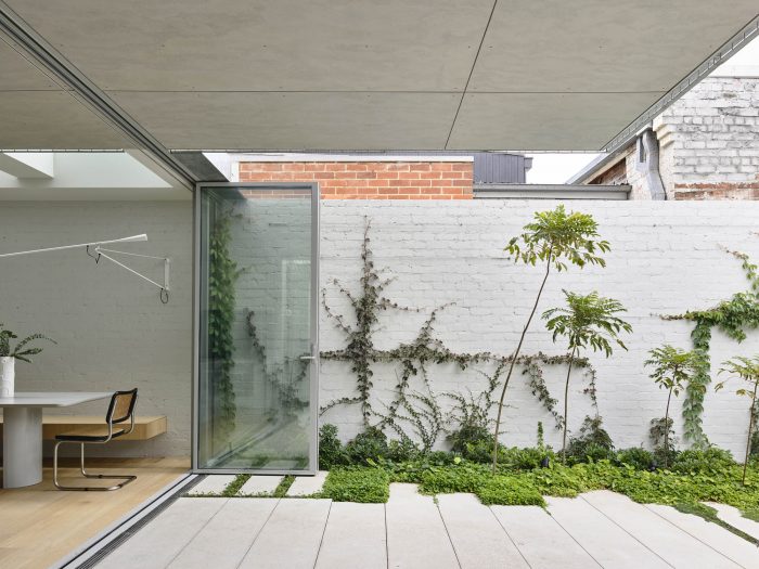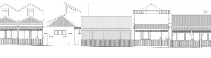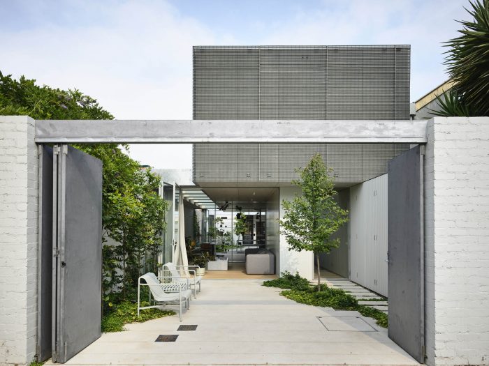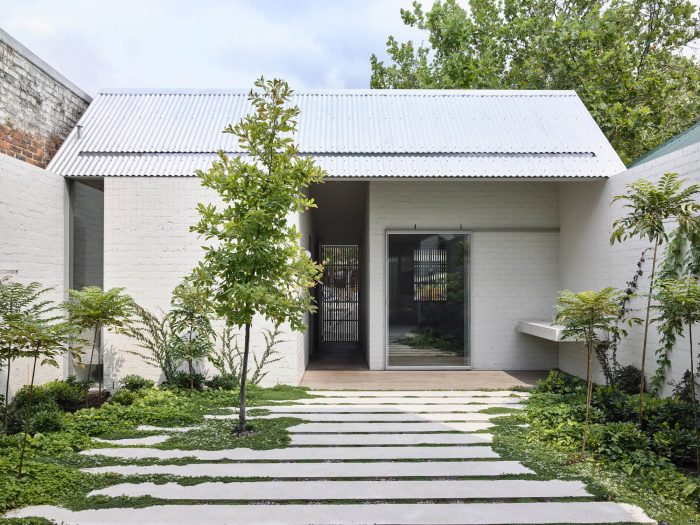 Aligned to an existing two storey boundary wall, the main part of the house sits between two gardens maximising access to sunlight. This idea abandons the traditional rhythm of a dwelling with a back garden. Perimeter brick walls border the site to unify the overall enclosure. A utilitarian material palette of cement sheet, brick, and galvanised steel flow through the home obscuring the spatial boundaries of the living environments.