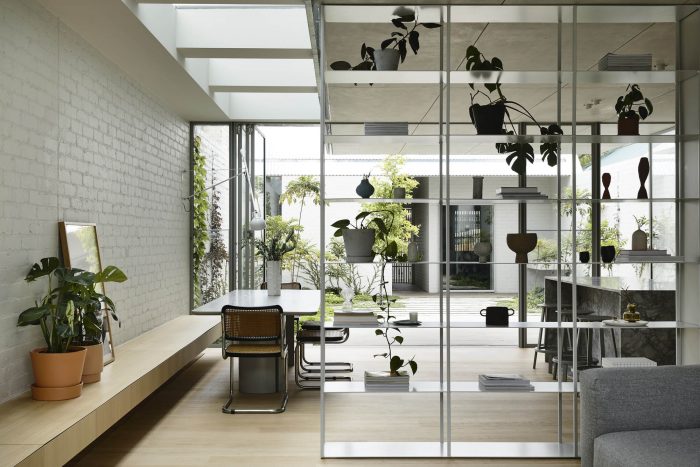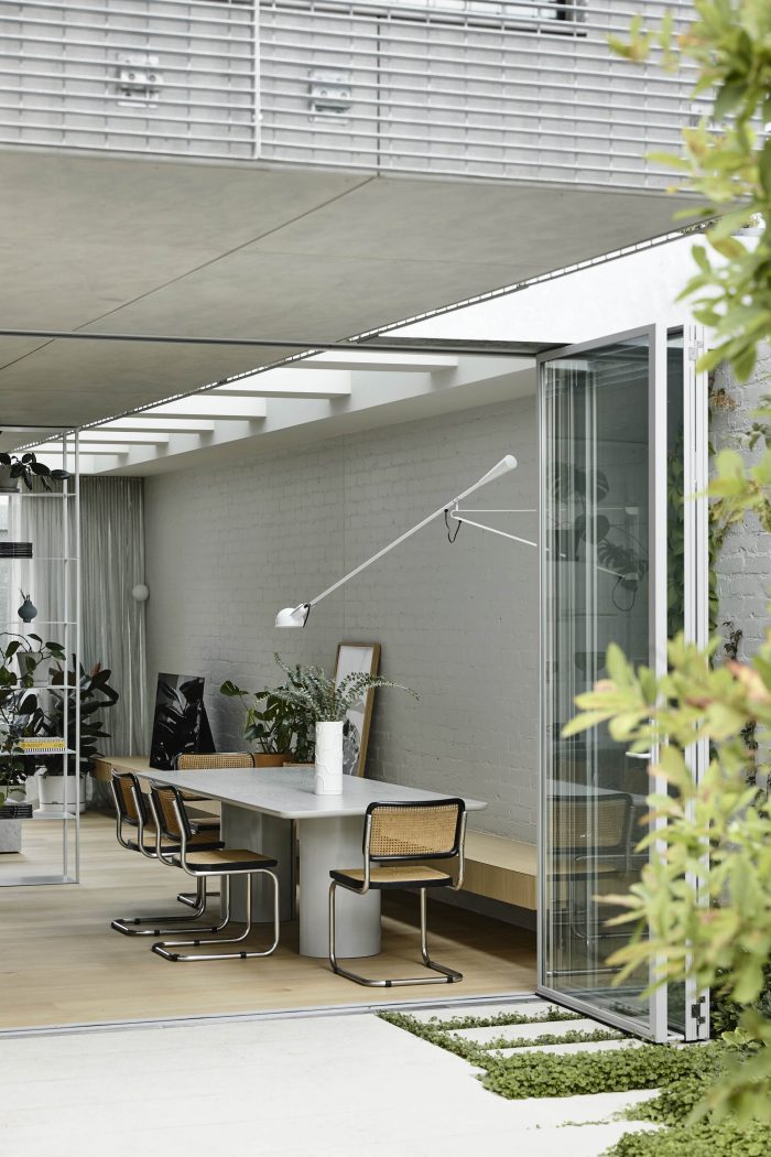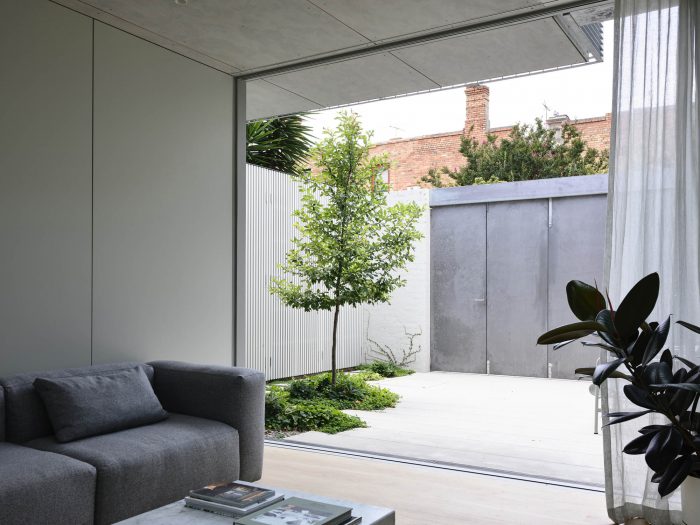 The entrance, an unassuming timber battened gate, opens to a narrow and unexpected external corridor which retains the modest proportions of a worker’s cottage and accentuates the openness of the garden beyond. On entry, you walk past the guest bedroom and studio where you begin to experience the concept of the house. ‘A house within a garden.’
