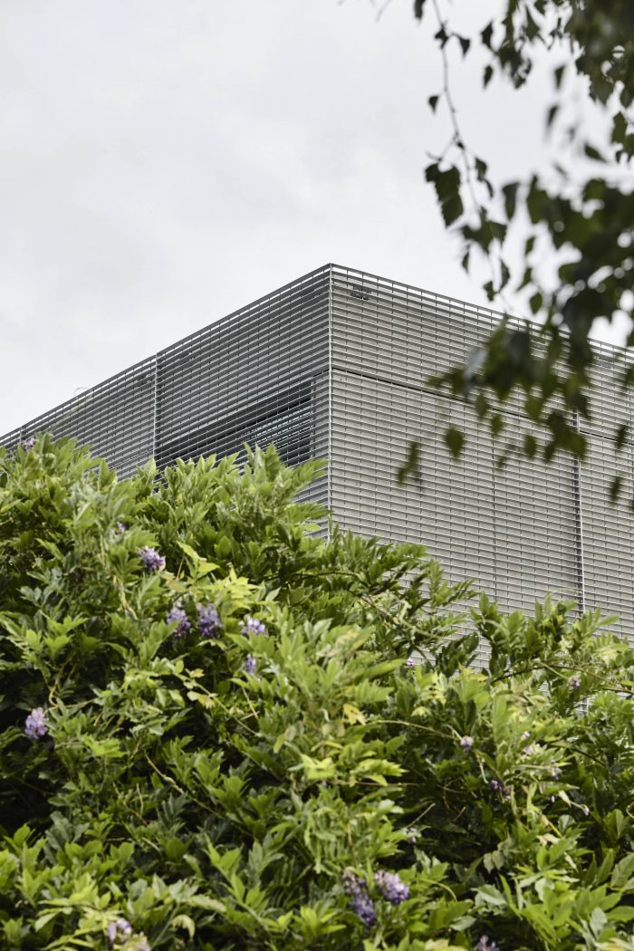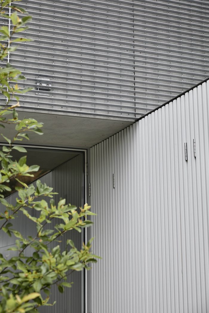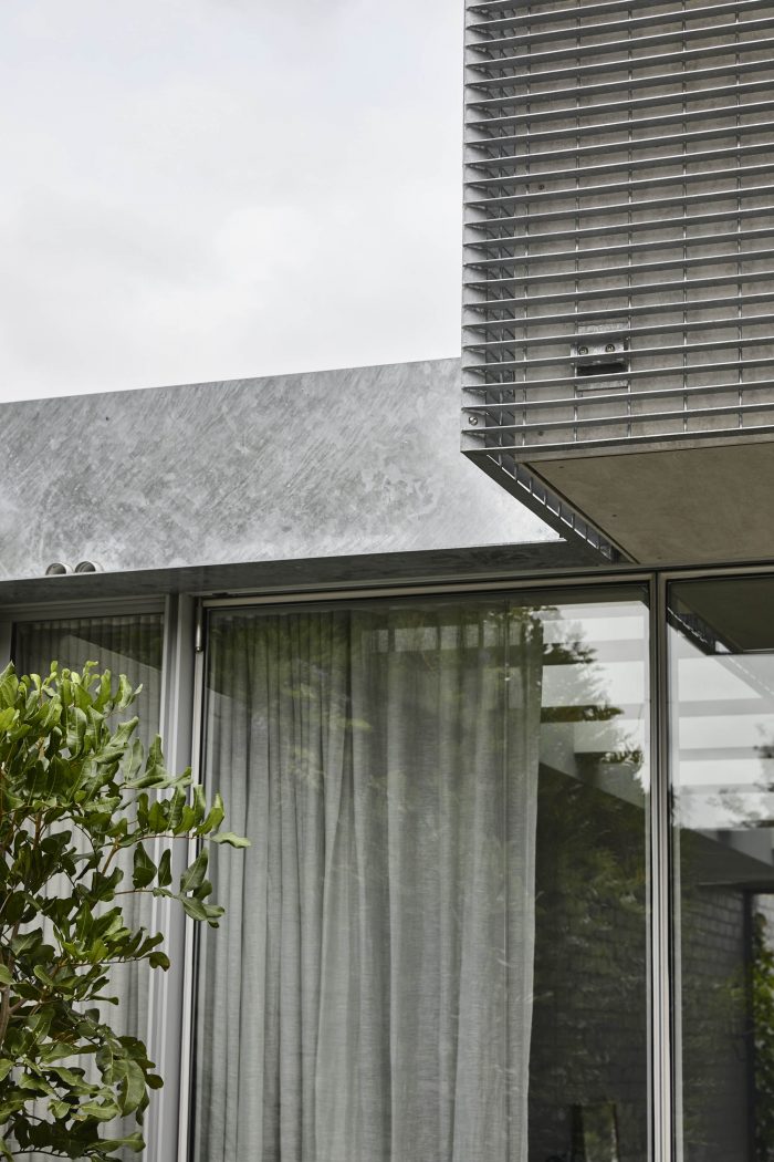 A galvanised metal grid encases, shades, and limits overlooking from the upper floor private domain, comprising three bedrooms and two bathrooms. This calm protected zone hovers above, providing areas of shade for the garden below.