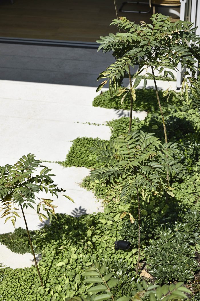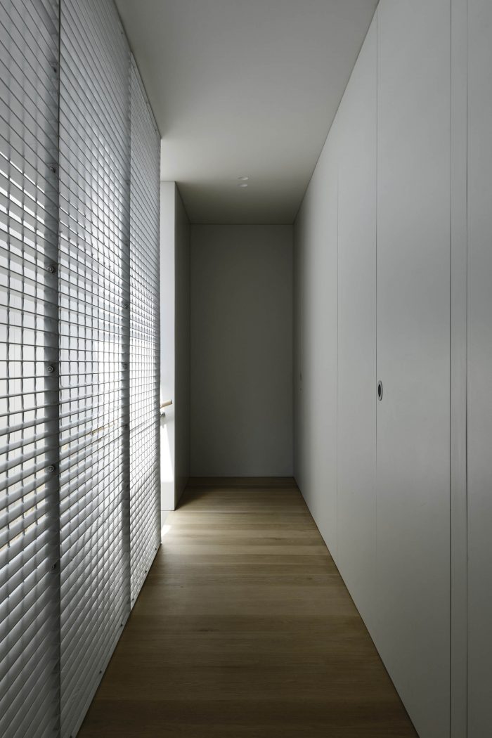 一个镀锌的金属网包裹着、遮挡着,并限制了从上层私人领域的俯视,包括三个卧室和两个浴室。这个平静的保护区域盘旋在上面,为下面的花园提供了遮阳的区域。