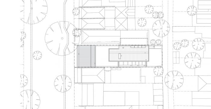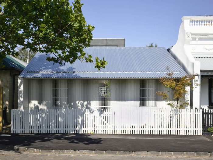 The house is separated into two distinct parts. The new cottage fronting the street consolidates the verandah and roof into a single hipped form as a simplified memory of a worker’s cottage. Two double brick wing walls, referencing typical terrace party walls, contain the building and support the low-slung verandah which aligns to the gutter line datum running down the street. Timber battens mask the front façade, allowing the traditional proportions of the cottage to be articulated in a graphic manner.