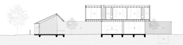 这座房子被分成了两个不同的部分。 临街的新平房将阳台和屋顶整合成一个单一的坡屋顶形式,作为工人平房的简化记忆。两个双砖翼墙,参考了典型的梯田墙,包含了建筑并支持低矮的阳台,阳台与街道上的水沟线基准线一致。木栅栏掩盖了前立面,使别墅的传统比例以一种图形的方式被表达出来。