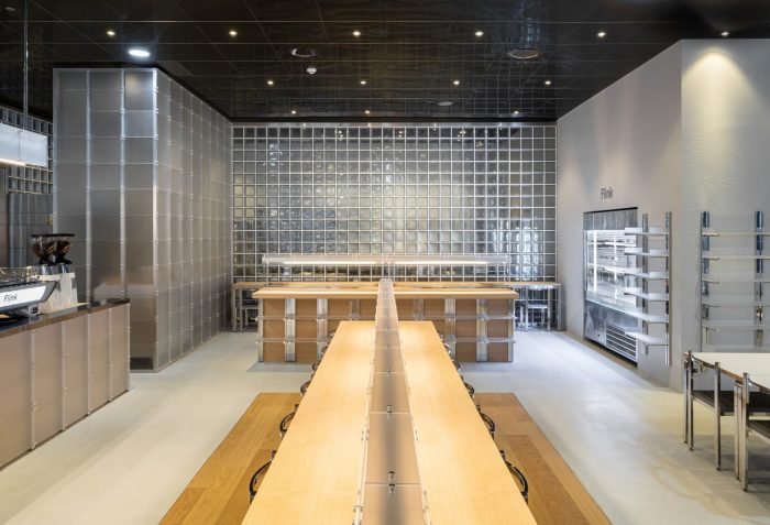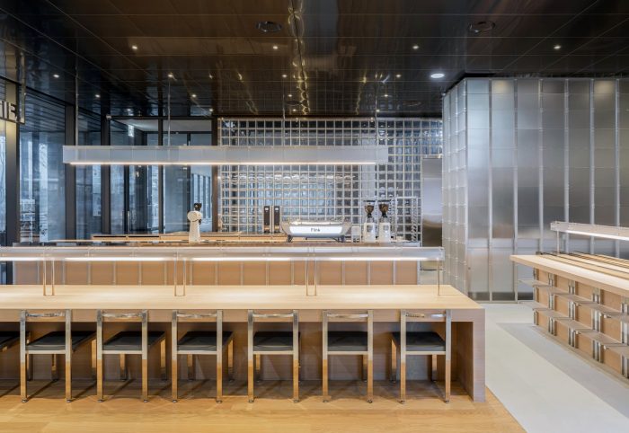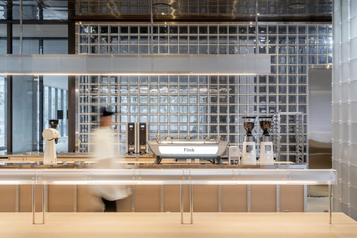 Flink is a bakery café brand located in Pangyo, where IT companies are concentrated and crowded with people all weekdays. The design point of this project is to show continuous rectangular patterns which are organized by modular formation. The used repetitive design language in modularity and provided changes in texture due to different material finishes under the high ceiling installed with stainless steel panels.