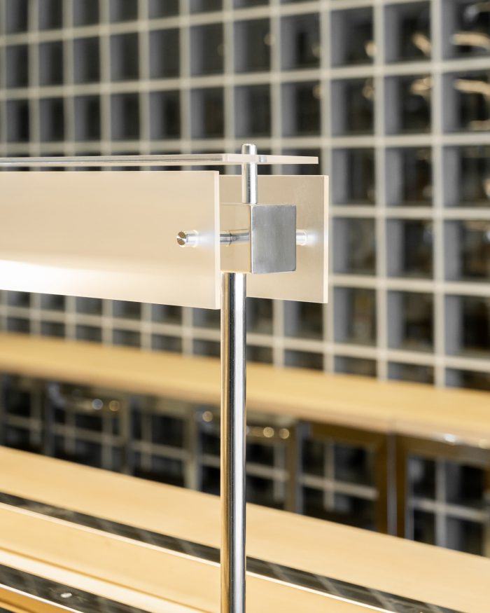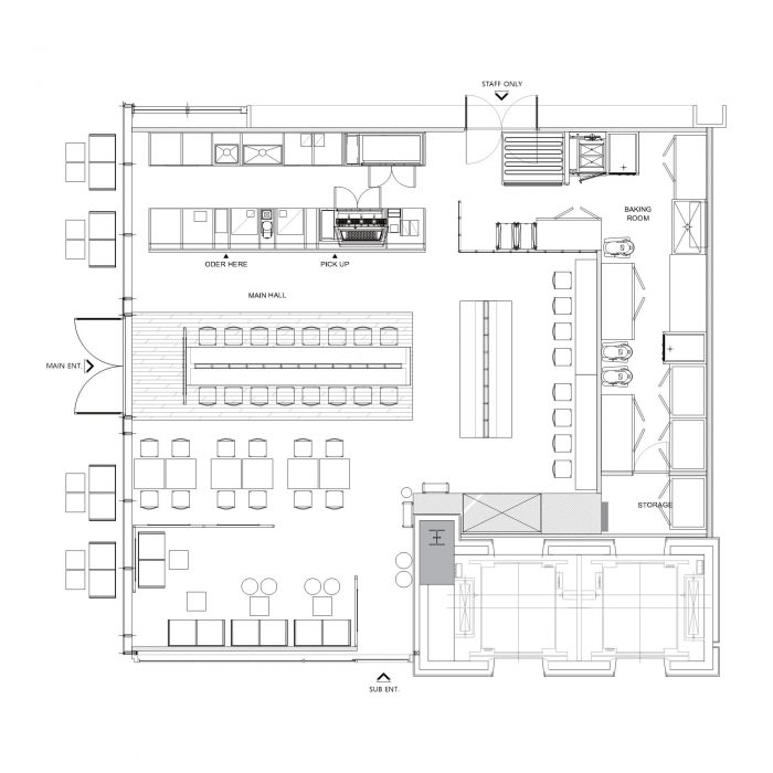 The project was planned with careful attention and consideration for the display of bakeries. As we went through the zoning plan, other than anything else, the most important goal was to draw the customer’s first attention to the bakery display. Accordingly, unnecessary elements were purposely blocked from sight by using glass bricks and frosted clear acryl. Also, like all the other bakery shops, due to changing bakery menus every month or season we designed display tables and shelves as the modular type which is very useful in various needs by adjusting them.