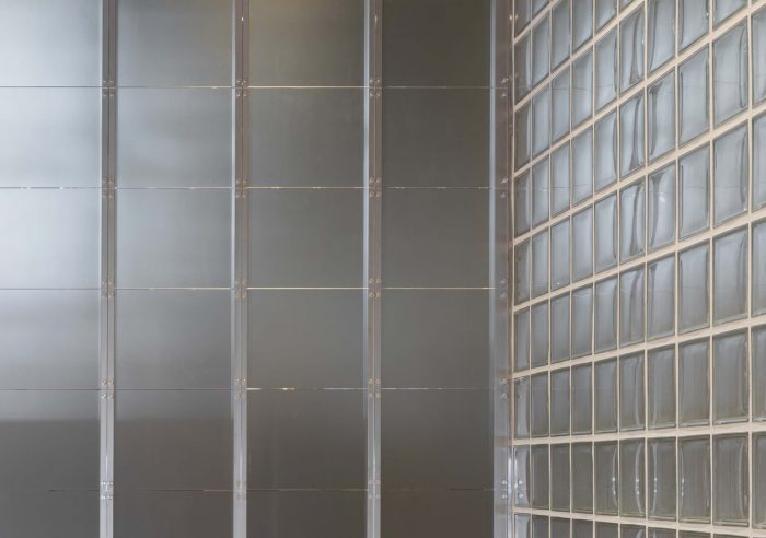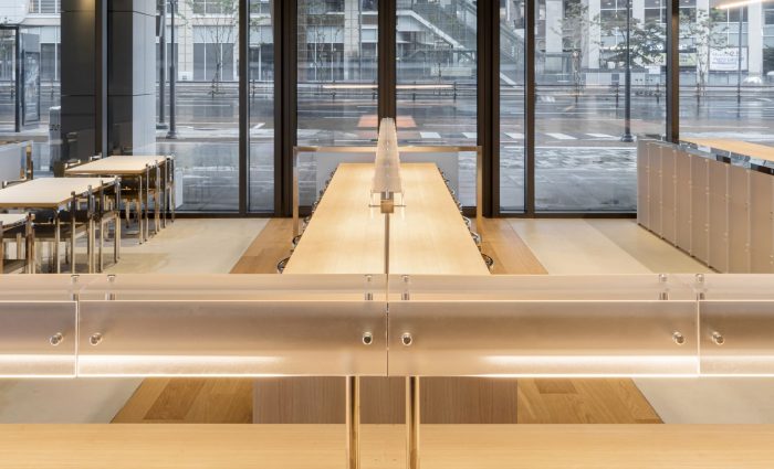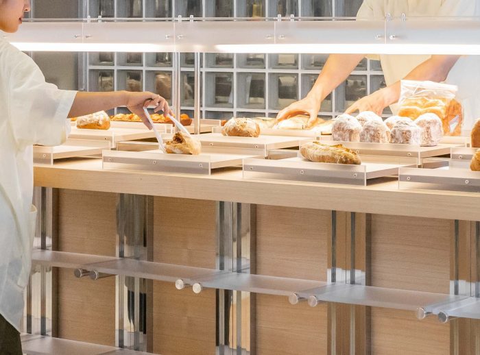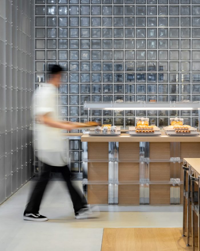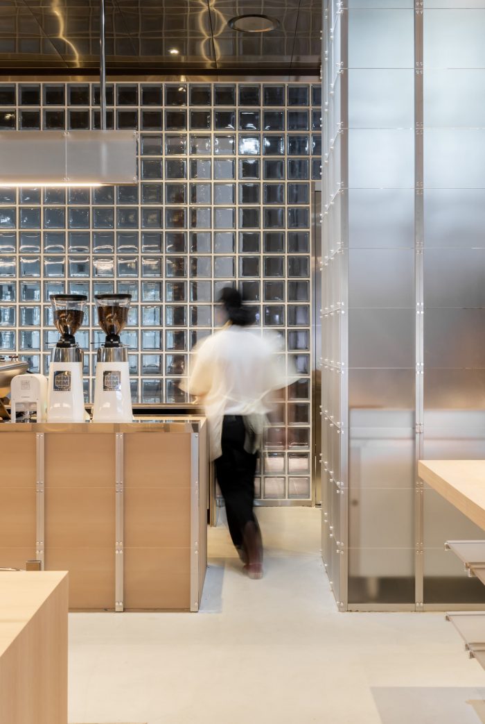 该项目在规划时对面包店的展示进行了细致的关注和考虑。在我们进行分区规划时,除此之外,最重要的目标是将顾客的注意力首先吸引到面包店的展示上。因此,通过使用玻璃砖和磨砂的透明丙烯,特意将不必要的元素挡在视线之外。此外,像其他所有的面包店一样,由于每个月或每个季节都会改变面包店的菜单,我们把展示台和货架设计成模块式的,通过调整它们来满足各种需求。