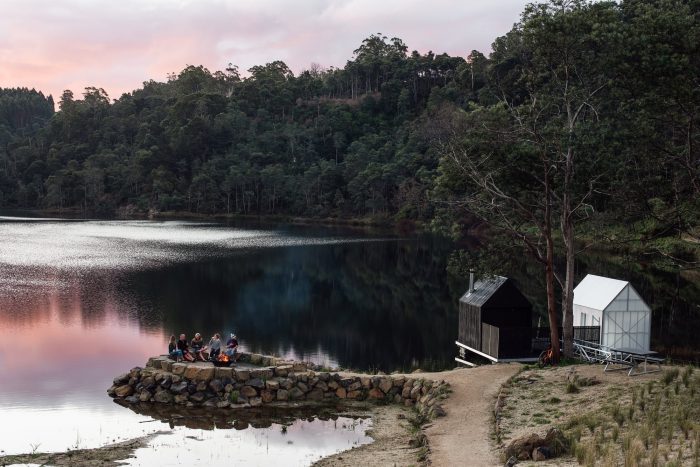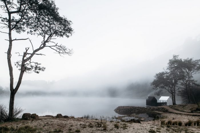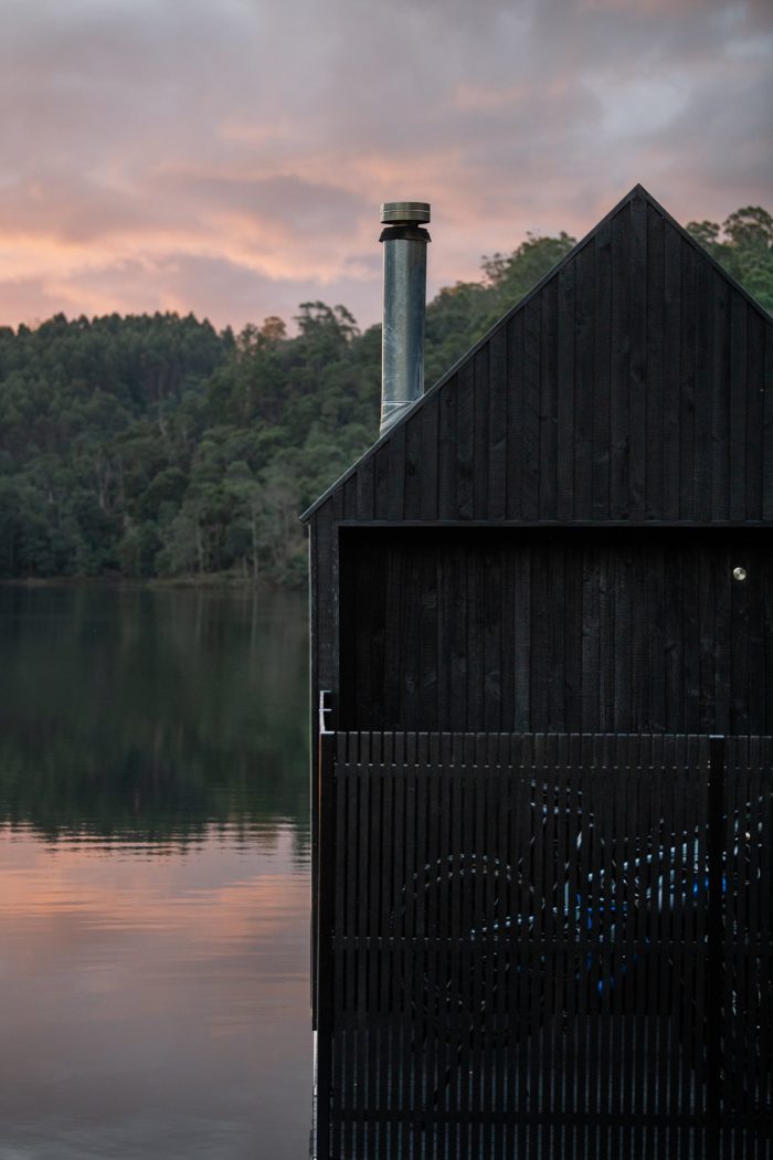 Leaving your shoes on the shore and crossing a small bridge, guests can store their bikes and get changed before soaking in the heat of the timber-lined sauna. Taking cues from Derby’s contrasting history of boom and bust (then, fortunately, boom again) two black and white gable sheds sit quietly against the dramatic backdrop of quarry cliffs and rainforest. The huge quarry cliffs to the North of the site block direct sunlight to the sauna until mid-morning creating dramatic contrasting cliff face shadow and light with the high sun peeking its way through the wattles and lighting up the ever-present fog on the lake.