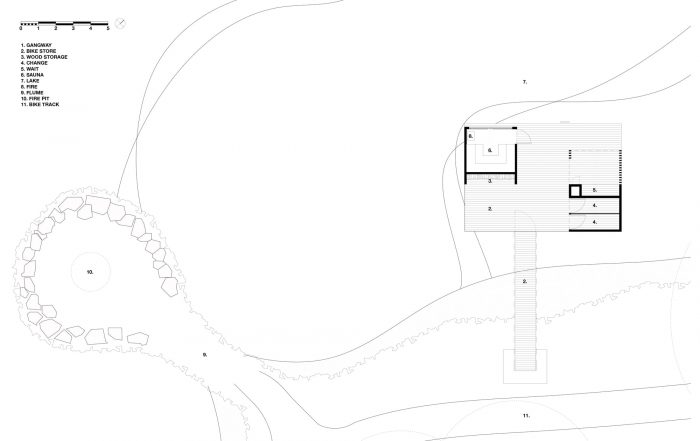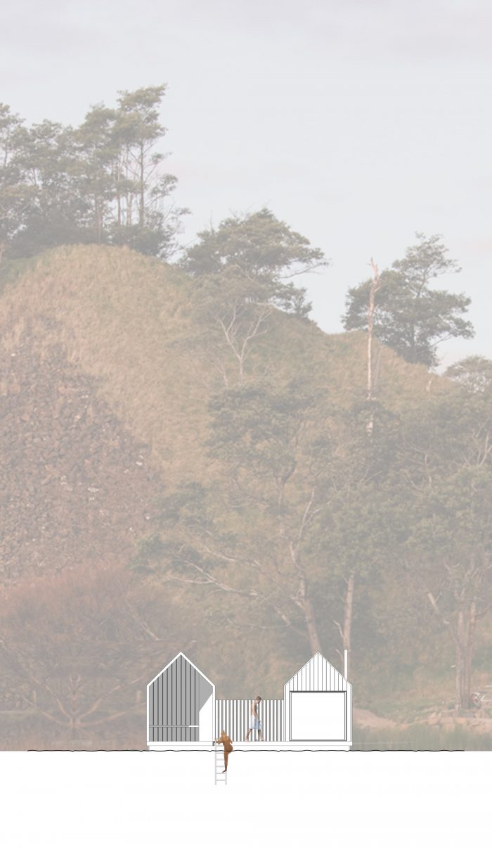 把鞋子放在岸边,穿过一座小桥,客人可以把自行车存放起来,换上衣服,然后浸泡在木制的桑拿房里。从德比的繁荣和萧条(幸运的是,后来又恢复了繁荣)的历史对比中得到启示,两个黑白相间的屋檐棚静静地坐在采石场悬崖和雨林的戏剧性背景下。场地北部巨大的采石场悬崖阻挡了直射到桑拿房的阳光,直到上午,创造了戏剧性的悬崖面阴影和光线的对比,高高的太阳从瓦砾中探出头来,照亮了湖上永远存在的雾气。