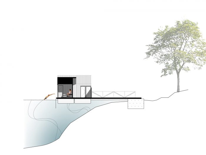 - 更衣室提供了围墙和避风港,以及脱衣服的隐私。一旦换好衣服,用户可以坐在阳光下,看着湖面,头顶上有屋顶保护,但半隐藏在白色板条屏幕后面--过往的骑手可以看到,水拍打浮桥的声音也可以听到。