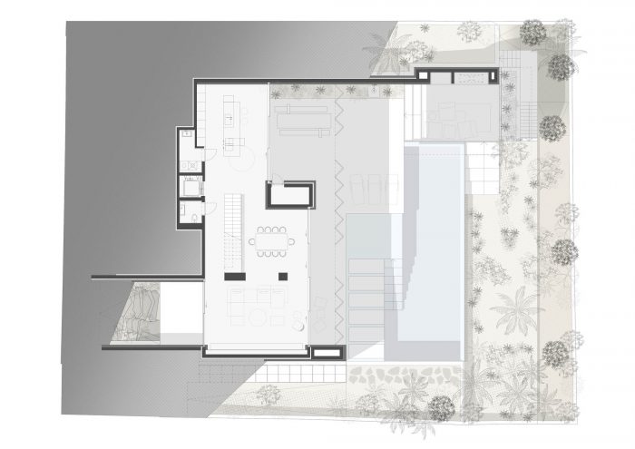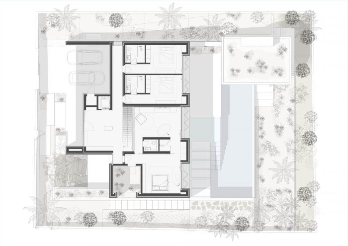 The house respects the local conditions, therefore it offers a number of natural shading or ventilating systems. First of all, the windows are pushed inside of the structure in order to create shading out of the concrete slabs