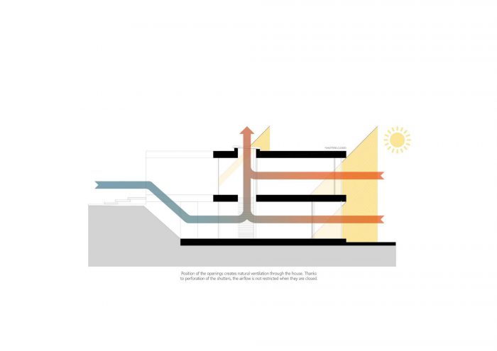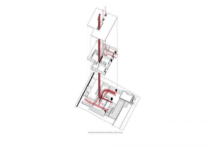 The design proposes natural ventilation, which can be used locally or in the whole house according to current needs. Various window openings on each story allow the fresh air to come in and flow through the house up to the skylights, which provides vertical and horizontal ventilation.