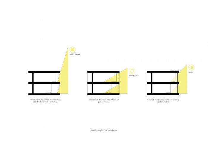 Besides the aesthetics, the massive facade helps to keep the house cool during the summer months and has a great potential for accumulating heat in winter.
