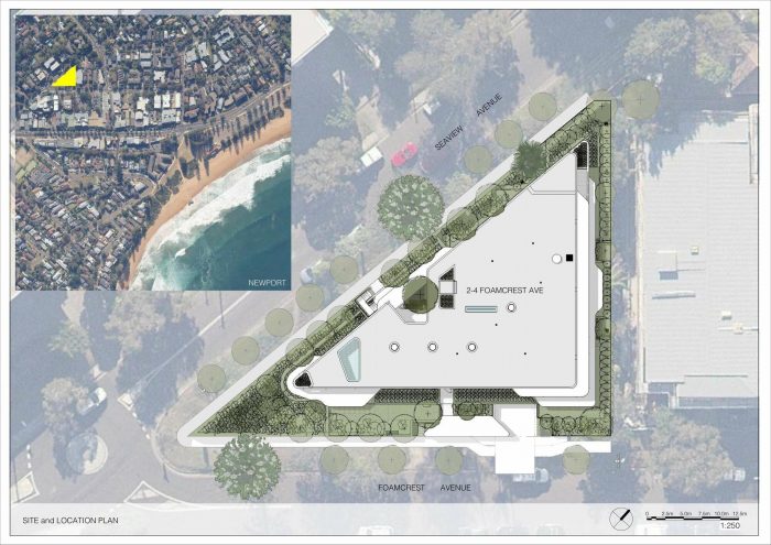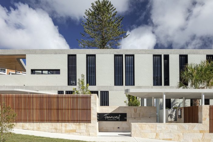 On a difficult triangular site in the coastal suburb of Newport on the Northern Beaches of Sydney, Foamcrest Apartments is a form generated from the unique site. A composition of glazed bricks, off form concrete and sandstone, and materials selected for their durability and appropriateness for the ocean side location, the seven apartments are 100% adaptable and differentiated by unique plans. With two prominent street fronts and a central lobby that is open to the sky, the design carefully balances solar access, privacy, and outlook. The form emphasizes a low profiled horizontality that is generally well below the height limit. The character of the building provides a fresh and contemporary contribution to the locality.