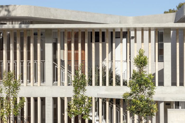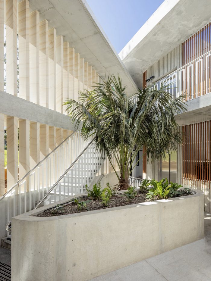 The common lobby is eroded into the form and open to the sky, providing a green center and increased opportunity for cross ventilation. The lobby has a delicate vertical detailing directing eyes to the framed view of the sky. Splashes of color differentiate it from the robust exterior. A Western screen of vertical sandstone blades provides dramatic afternoon patterns of light. Feature tree planting including locally endemic Cabbage Tree Palm groves provide attractive vistas and enhance the character of the locality from the prominent southern intersection, also providing links to the existing Newport village planting theme.