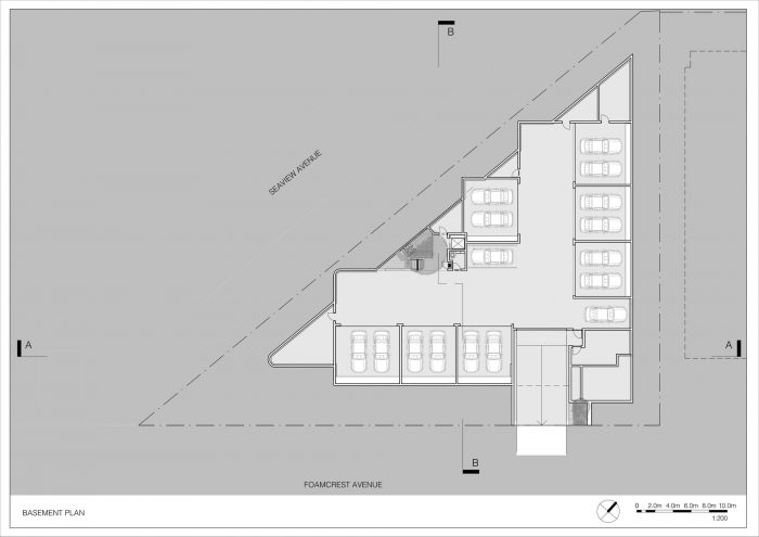 The site slopes down to the north, providing a wide northern aspect and enabling a sense of protection from the busy southern roundabout. The unconventional profile is translated to the seven apartments, which are differentiated by unique plans, each a response to its location within the overall site. Subsequently, this provides a level of choice and identity unusual in multi-residential developments. The planning transforms problematic triangular corners into opportunities to open onto multiple aspects, with the benefit of greater solar access and cross ventilation. Five of the seven apartments face due north.