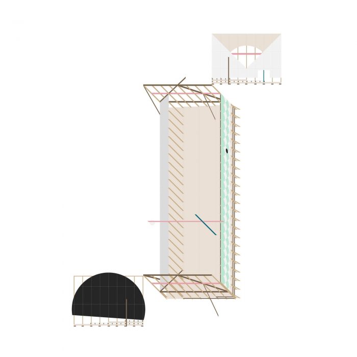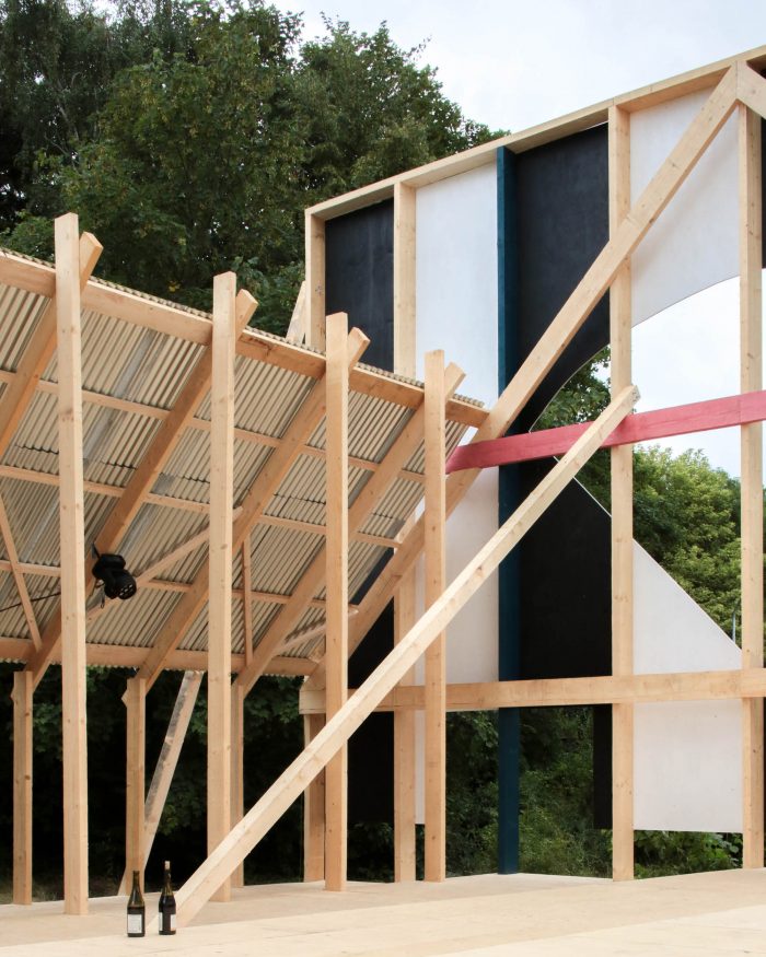 Essentially made of local wood, a careful use of paint clarifies the reading of the architectural elements. The coherence of the project is proudly loose and open to interpretation. Green and white plywood tiles become feathers towards the outside, horizontal stripes on the inside.