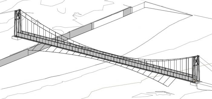 柱子之间的距离为84米,自由宽度为2米,松木甲板相对于河流的自由高度达到了5米。有两个9米高的支柱和两个主要的钢缆(导管)。通道是混凝土坡道,与环境中的植被和地形保持一致。