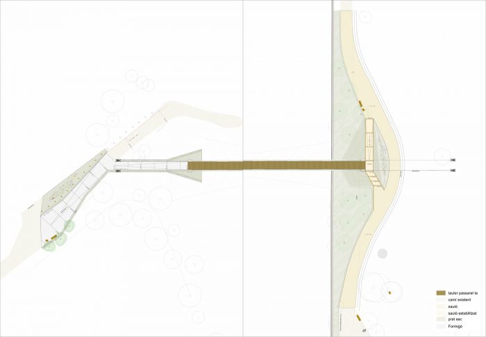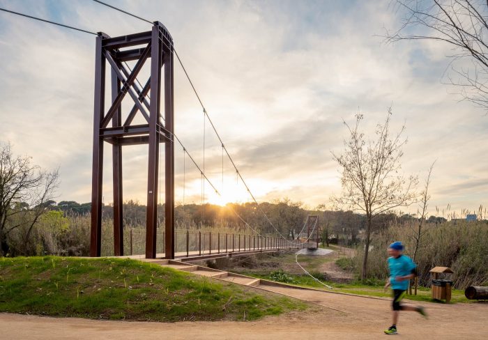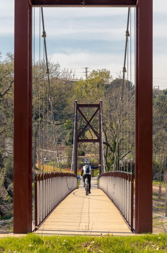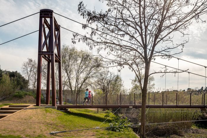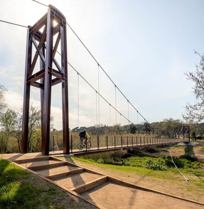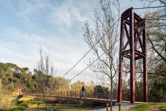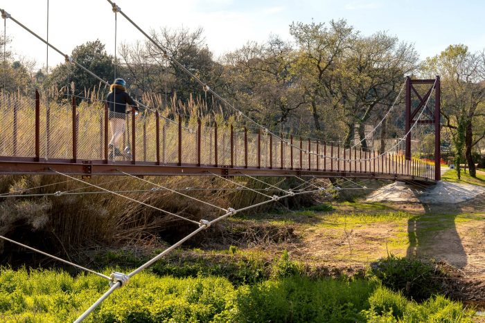 The hanging metal footbridge connects the Molí Vermell wetlands and the urban center on the right bank of the Ripoll River with the Castell de Barberà and the green ring of the municipality on the left.