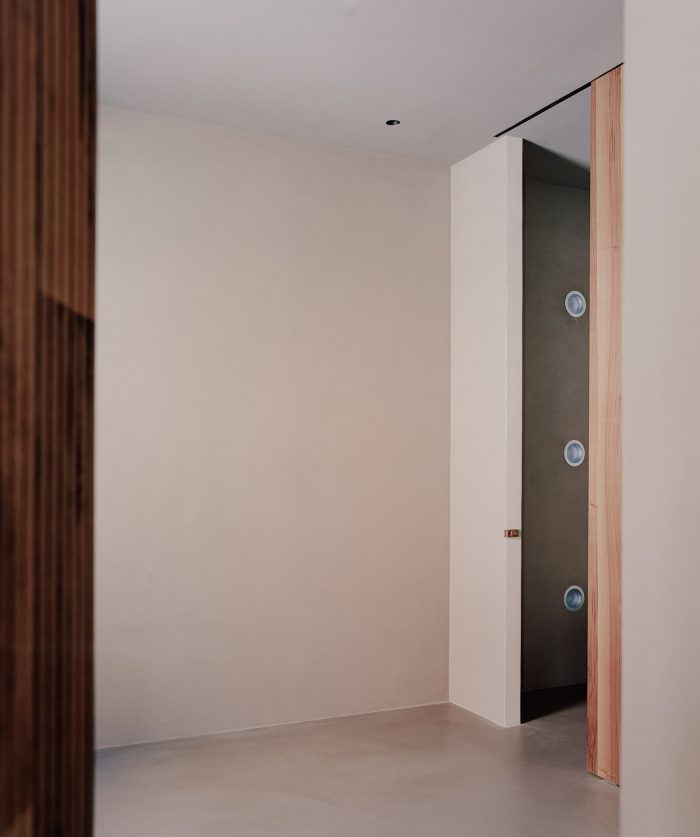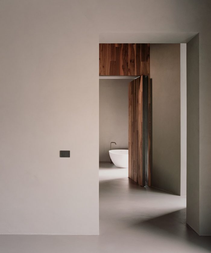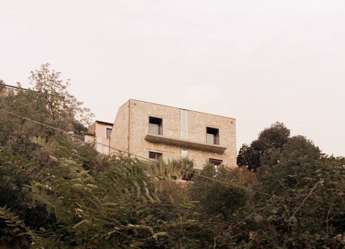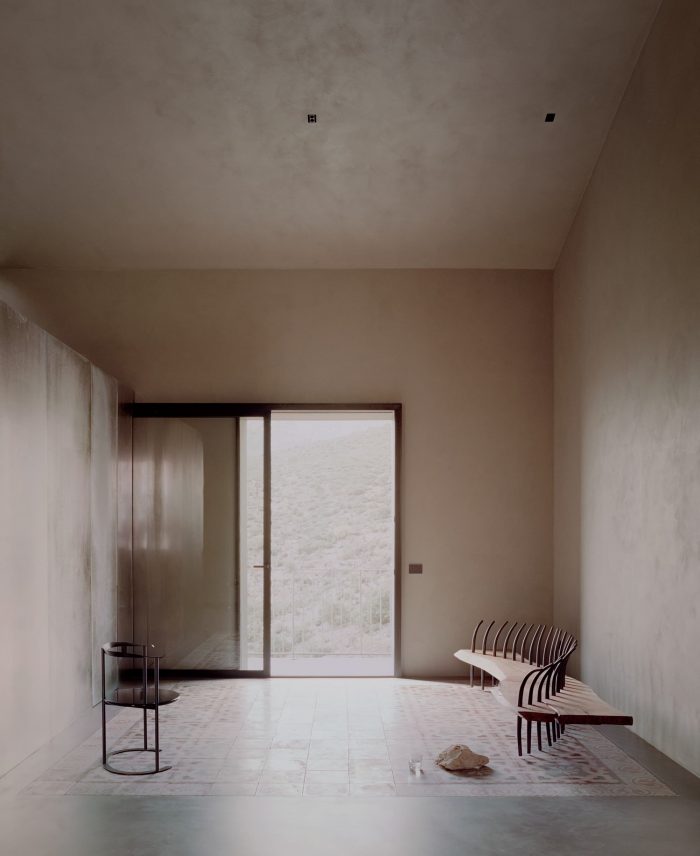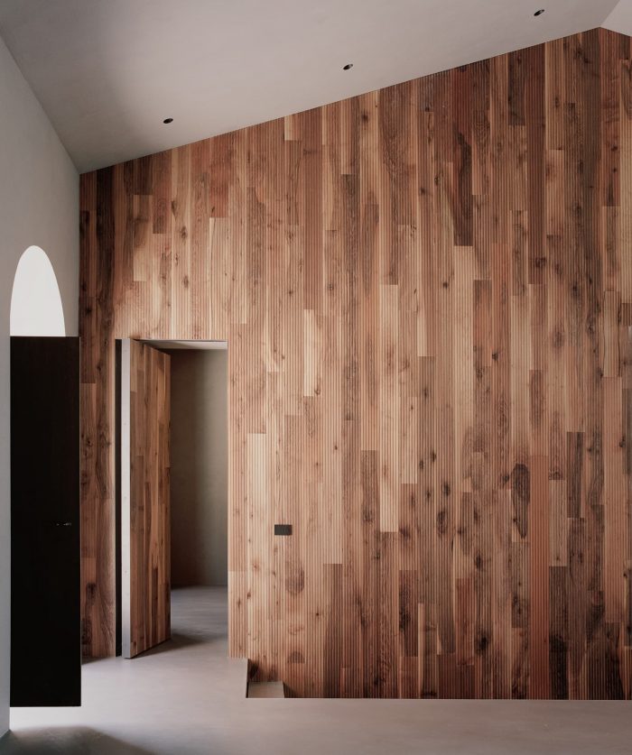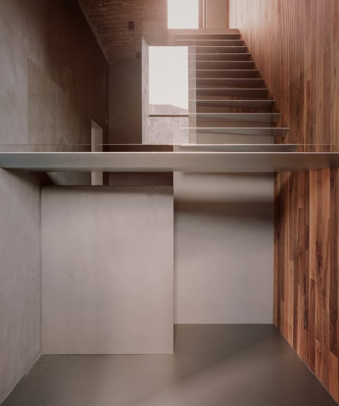In the southern wall,16cm holes create a potent natural light source. The general idea was of having some internal spaces with contrasting areas of shadow and light. The ground floor contains two bedrooms and a living area, all full height, and also features a volume of metal that contains a bathroom. From this space, one can admire one of the two central walls, also at full height, which was layered in wood. From here, the view opens to the valley landscape and the terraced gardens.