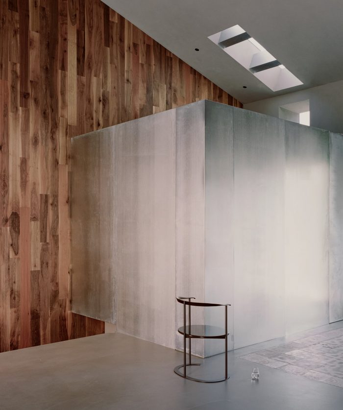 A slab of metal at the lower ground frames one of the openings of equal dimensions and it represents a privileged point of view toward the beautiful landscape of the valley and of the garden. A distinctive element of the project is the inclusion of a vertical cut of glass starting from the bottom layer at the valley, passing through the stone wall, and hitting the ground as a nod to the previous division in two of the house. A fixed 11-meter-long glass creates an imaginary division of the building.