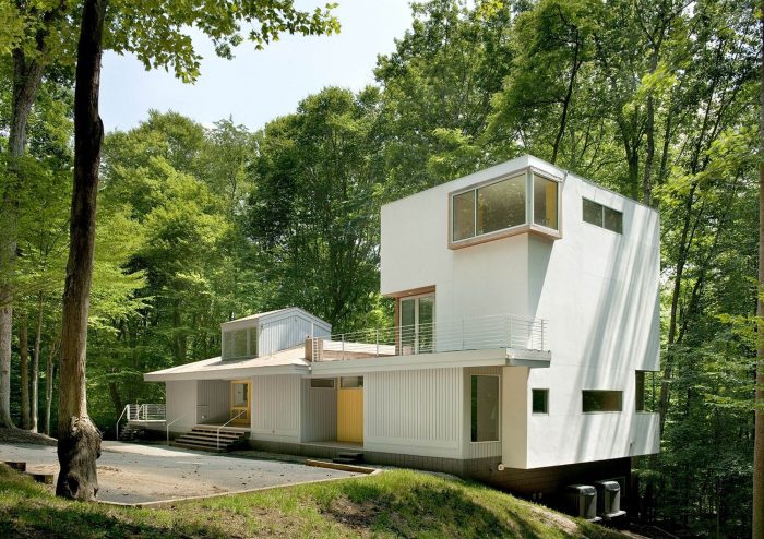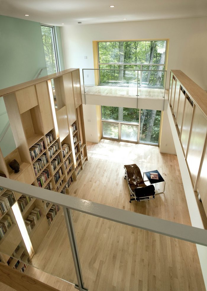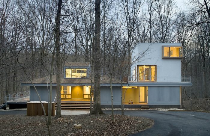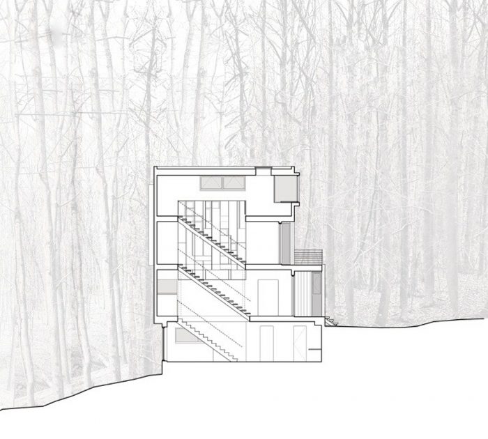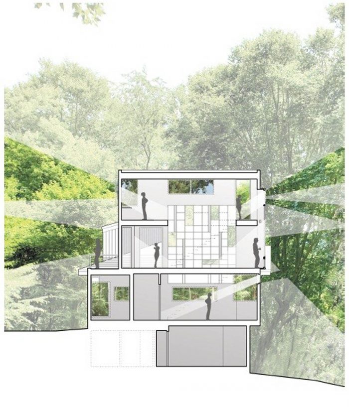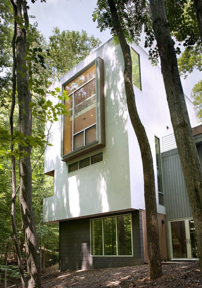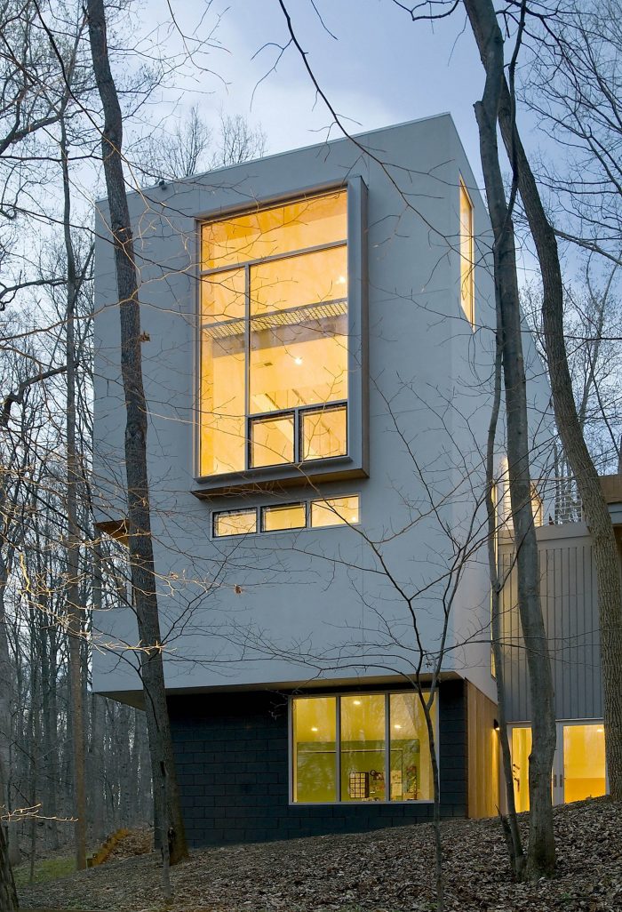 A "tower in the forest" this house sits on a 3-acre wooded site in Great Falls, Virginia. Although the tower is a separate structure from the existing house on the site, they are connected by a 2-story link. The overall design concept was to create a "house as frame" for the landscape. As one ascends higher and higher in the tower, framed views of the surrounding forest are revealed in each direction through large window openings.