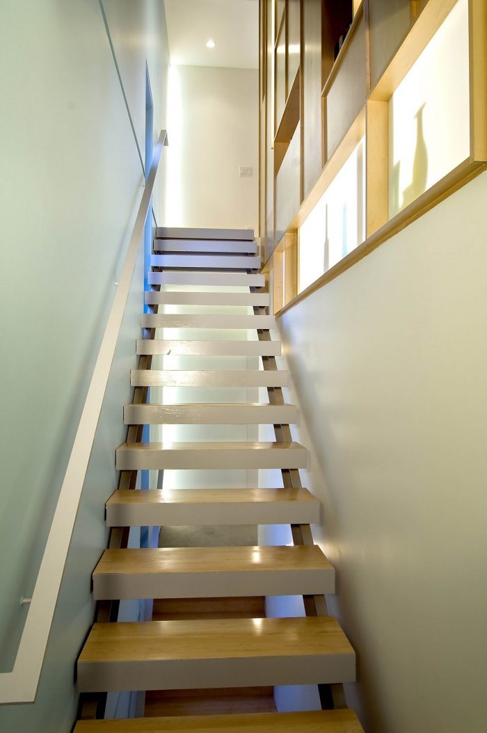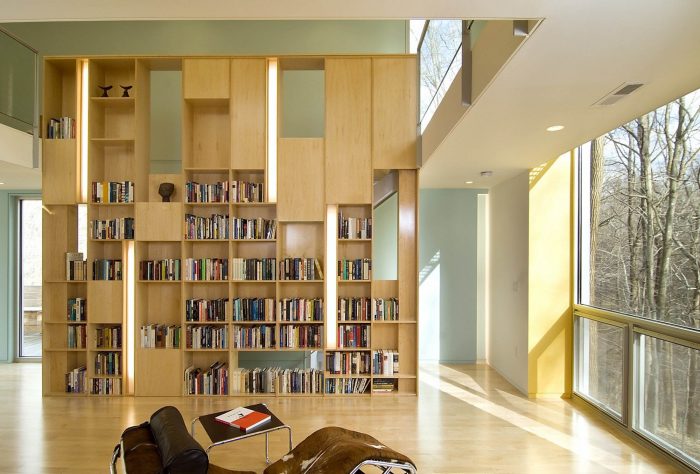 The program consists of a playroom and bedroom suite on the lower level, master bedroom suite on the first floor, media room above, and office on the top floor. The media room and office are open to each other through a two-story space, and a large bookcase running along the staircase connects each space vertically. While the new tower is unique and different architecturally from the existing house, the two are connected by a plinth on the ground level, which sets up a continuous rhythm from one building to the next. However, on the floors above, the tower departs from the main house completely, establishing its own place in the landscape.