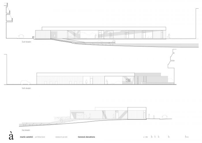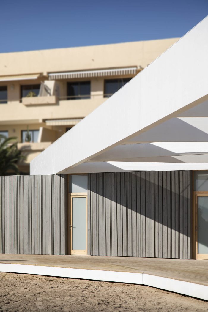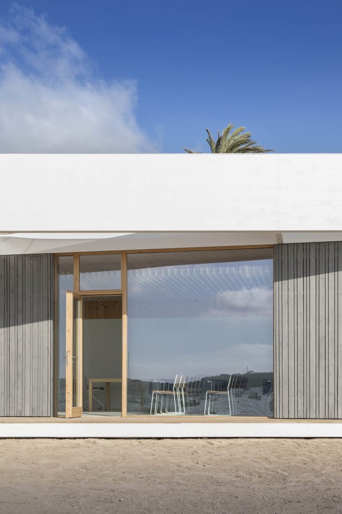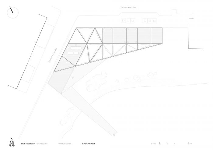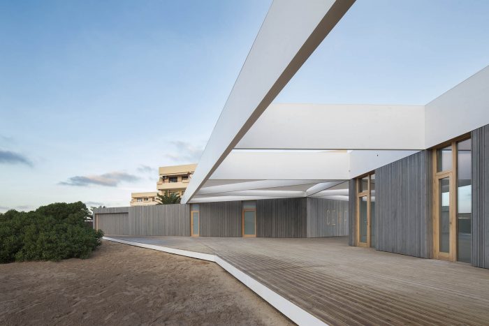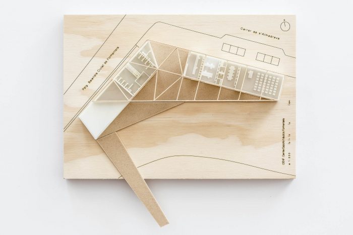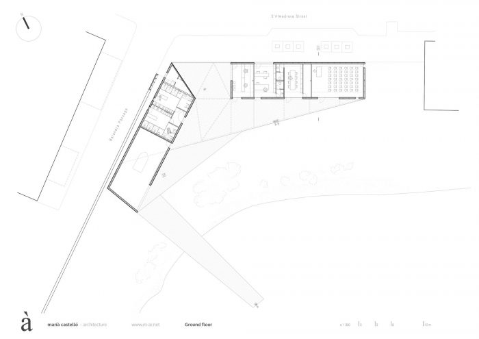 The functional program offered a duality (classrooms + offices versus workshop + dressing rooms) that has divided the volumetry into two independent parts aligning the first one with Almadrava Street and the second one with the passage of Balandra. At the intersection of both streets, the building offers an empty space with its visual permeability that incorporates the main access to the equipment. Between the two described volumes, there is a structure that provides a chill-out zone in the shadow and with its oblique geometry invites to enjoy the amazing views opening towards Estany des Peix.