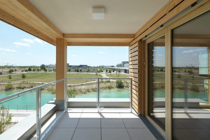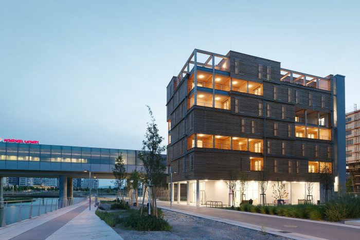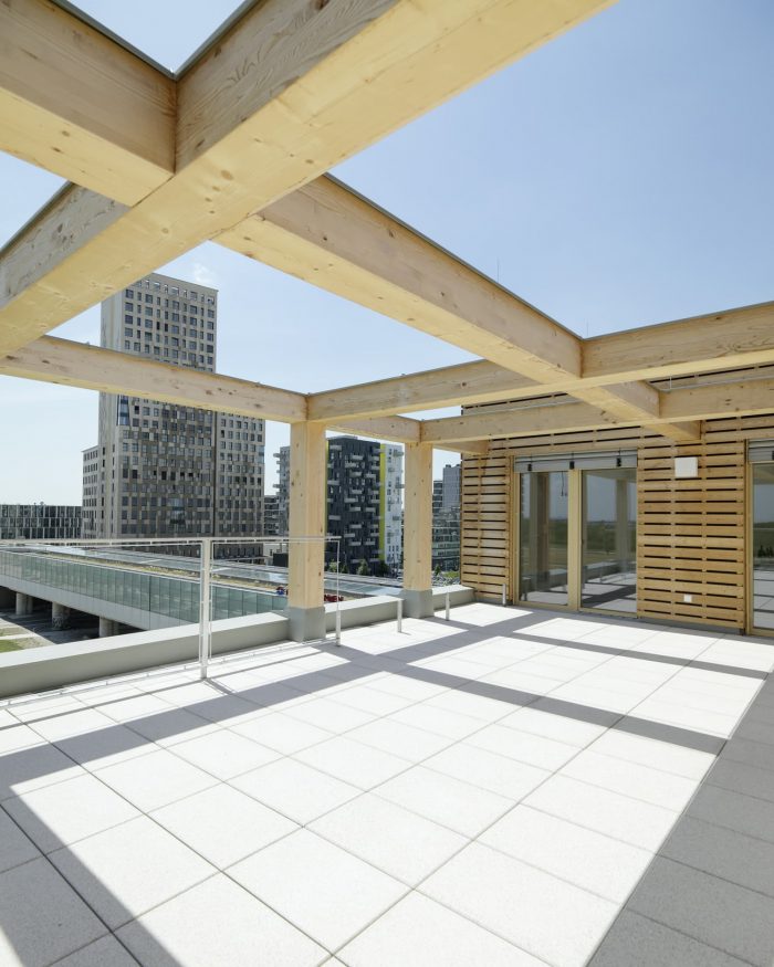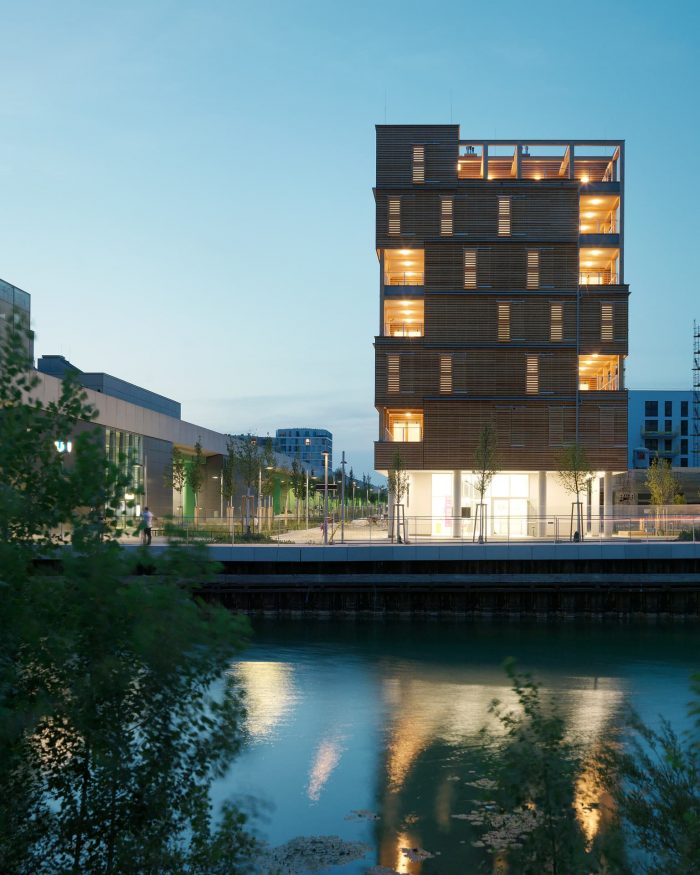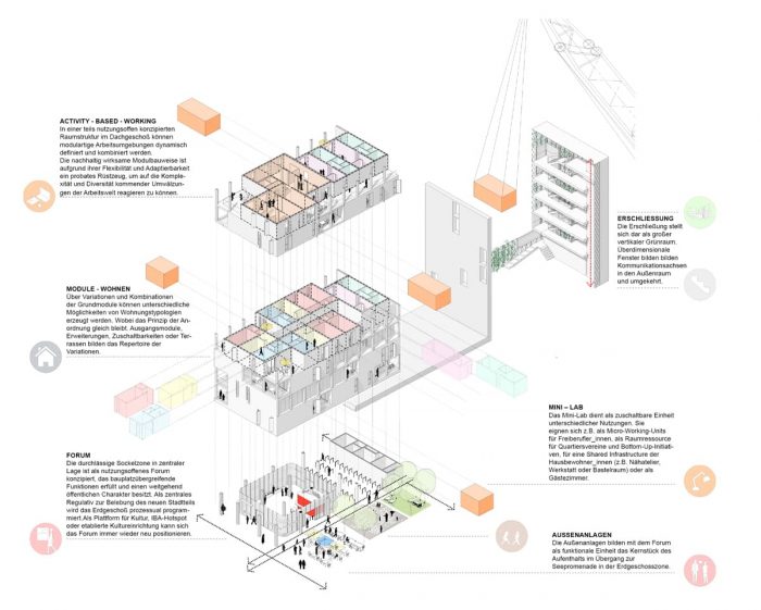 On the upper floors, various combinations of prefabricated basic modules of different housing typologies are created. Output modules, extensions, spaces that can be connected if required and terraces offer a variety of possibilities. Small entities can be used as mini-labs, micro-working units, or shared infrastructure, they are integrated in the structure in the same way as a big area for activity-based-working on the top floor.