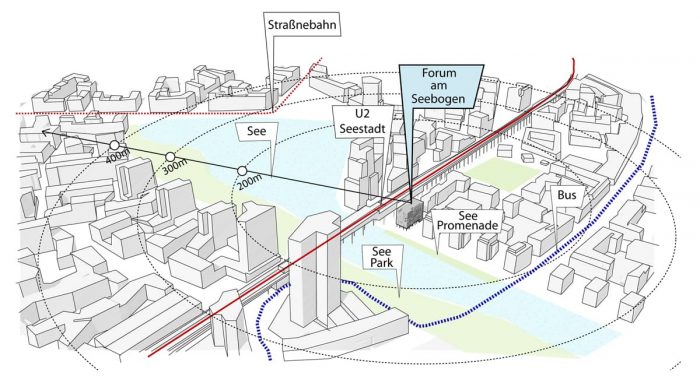 It s a temporary platform for artists and cultural workers that in the long run can become an established cultural institution as well as a temporary hotspot for IBA_Wien 2022; by means of an innovative exposition area and an outdoor city model the development of “Seestadt” can be experienced in a playful way. Along with the attractive outdoor facilities, the forum creates a functional entity that in the transition towards the lakeside promenade invites a visit, a longer stay, and a dialogue.