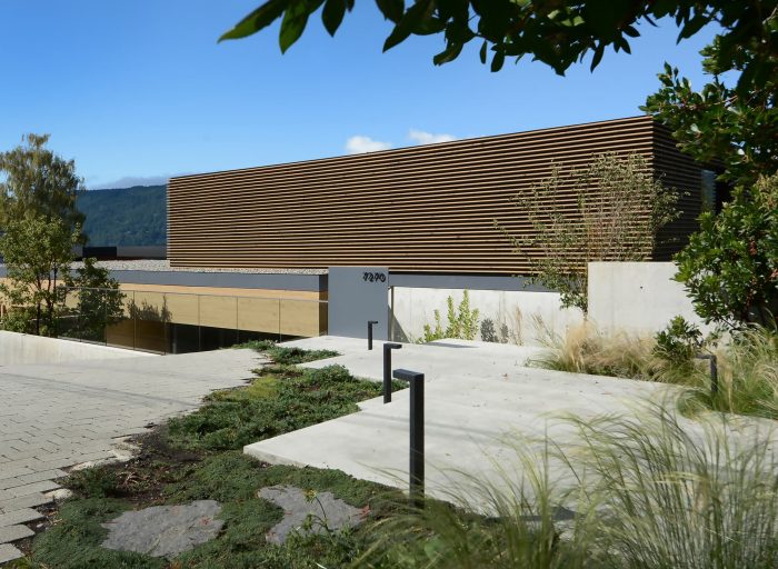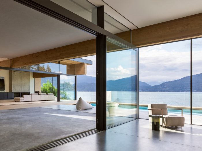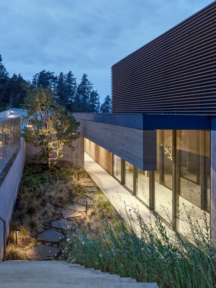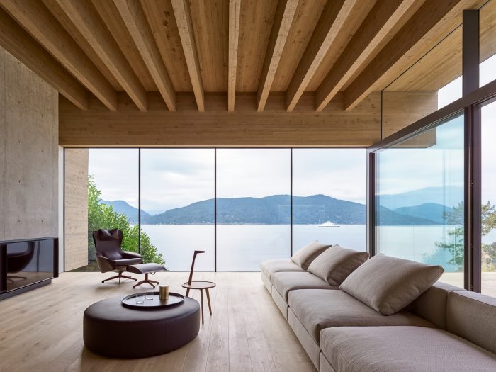 Situated on a steep waterfront lot flanked by a suburban context, the Four & Four House knits together the client’s affinity for mid-century, post-and-beam construction with contemporary adaptations. The site’s generous width with its semi-naturalized condition presented an opportunity for landscape elements to organize the sequence of the house in the form of four distinct courtyards. Clad in locally-milled yellow cedar, four massive beams frame these spaces: