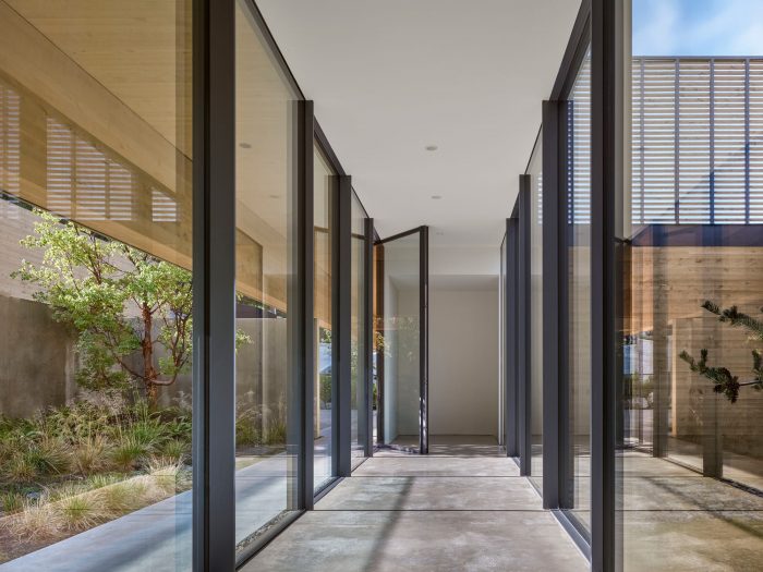 Spatially, the central courtyard separates the flanking formal and informal living areas while still allowing visual connection through full-height glazing. A fully glazed gallery acts as the intersection between the living spaces, sunken courtyard, and garden. The upper floor—a screened volume that contains the bedrooms—spans the outdoor living room below like a bridge.