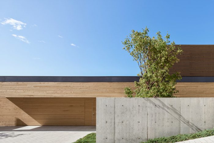 This volume is strategically shifted toward the street so that the monolithic façade at the south elevation conveys a sense of privacy when viewed from the street. Meanwhile, lowered window heads visually reduce the house’s massing from the water’s edge to give it the appearance of a single-story volume following the client’s appreciation for mid-century aesthetics.