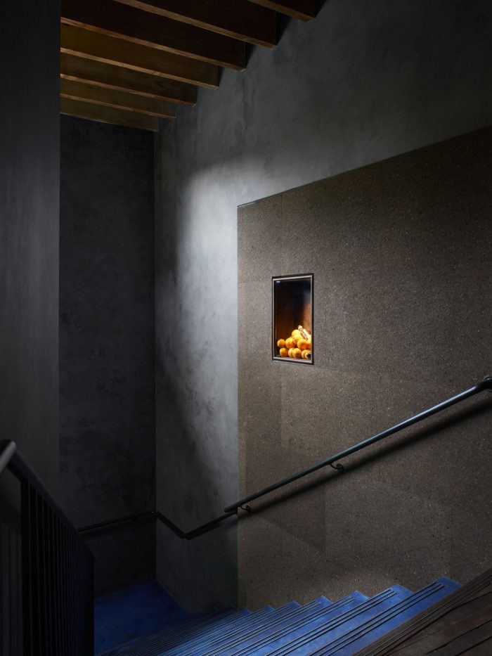 通往杜松子酒实验室的楼梯墙面采用木炭葡萄牙软木板,以其可钉的表面巧妙地解决了声学和可更换的内部广告需求。这种材料包裹着墙壁(包括艾琳酒吧的墙壁),在艾琳酒吧内变形为长椅的弯曲木制饮水台的正上方,为其昏暗的表面赋予了颗粒状的、类似于夯土的纹理。墙面被包裹着,具有舒适的吸引力,它们退到黑暗中,保持对中心鸡尾酒制作行动的关注。天花板是原始的,它的木材托架暴露在外面,横梁之间的缝隙显示出原始的铜制镶嵌物,而抢救和重新利用的木材地板进一步增强了空间的故事性吸引力。