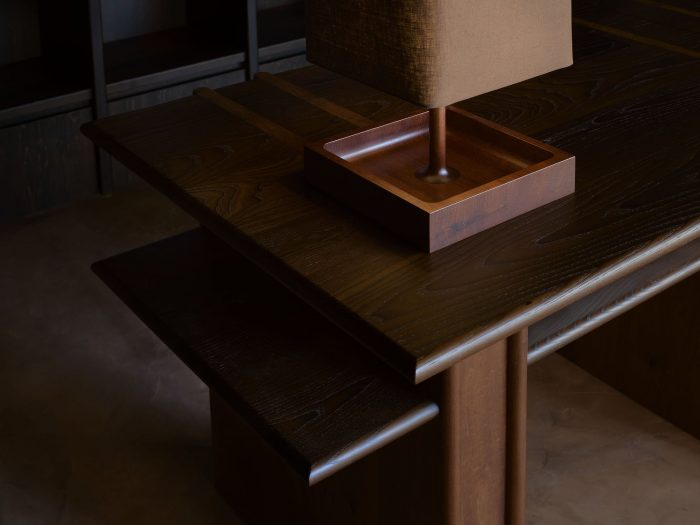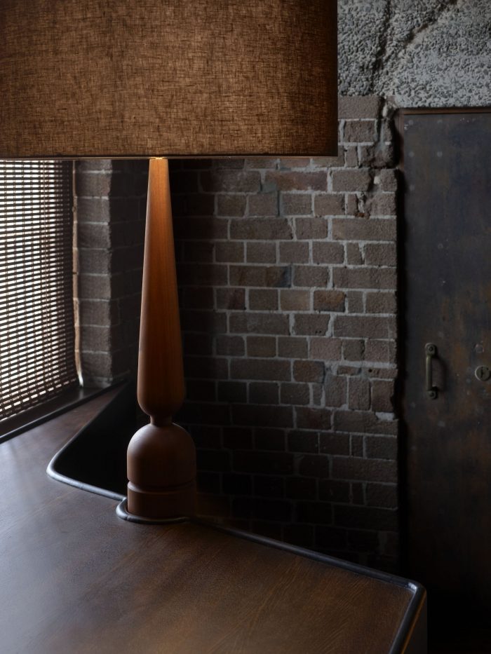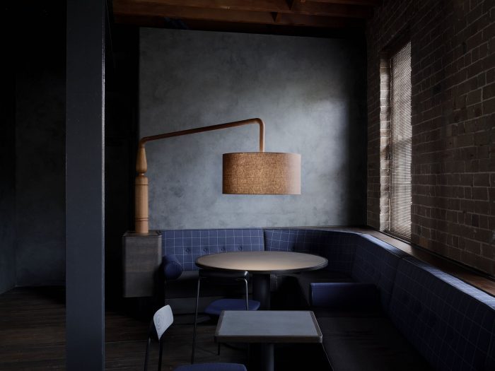The venue’s offset walls run parallel to the angled bar with comfortable banquette seating organised around its perimeter fashioned from deep blue and black tartan Kvadrat/Raf Simons fabrics. Integrated within the dark timber joinery hugging the space, custom carved Red Cedar lamps – whose curved shafts mimick the outlines of various stills – are fitted with hand-dyed linen shades to infuse the surrounds with a gentle glow. Along the rear wall, the joinery transforms into in a moody alley of undulating timber tables. Dubbed ‘Tinder Lane,’ it anchors cosy settings for two. Dotted amongst the walls (and beside the bar’s entrance door), glass-faced timber niches artfully display signature merchandise and seasonal perishables, bolstering brand activation.