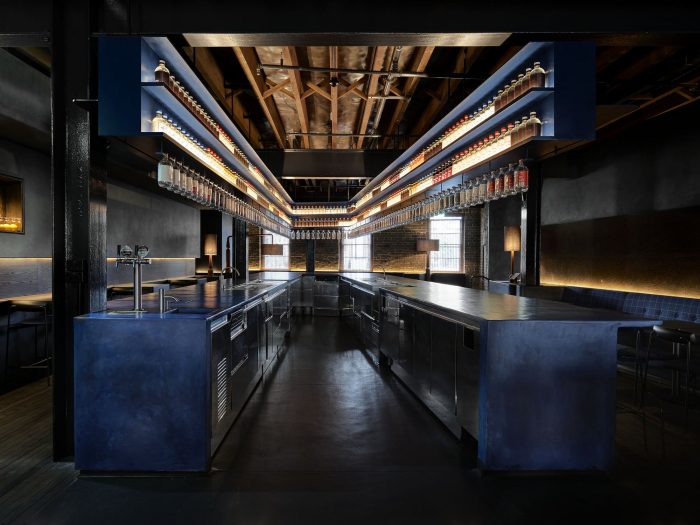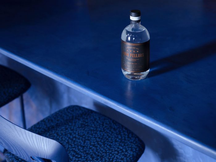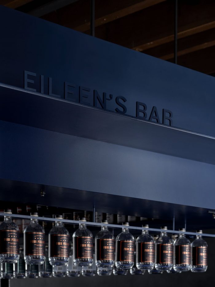 Eileen's Bar - The pinnacle of the Four Pillars Sydney experience, Eileen’s Bar, is accessed via a separate door on the corner of Fitzroy and Crown Street. The giveaway is the four dots projected on the doorstep plus a single copper brick and copper-etched door handles displaying the logo. A Pandomo-finished bright blue staircase leads to the bar’s centrepiece: a V-shaped bar with blunted corners spanning 11m in length within the centre of the 112-person venue (including the Gin Lab). Its vivid ‘juniper berry blue’ tone (a mix of dried juniper berries and Four Pillars navy) exudes a slight sheen under a crown of illuminated gin bottles an aesthetic alternative to vernacular speed rails. The bar module itself was designed in collaboration with the Oslo-based bar design agency Behind Bars. Its bespoke stainless-steel units forged in Italy integrate seamlessly within its generous surface width.