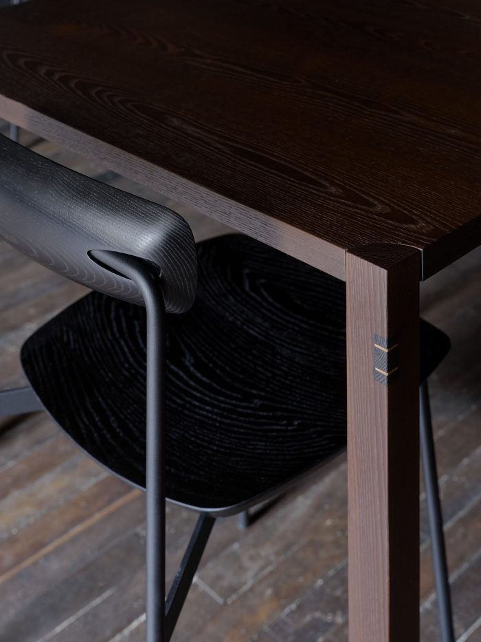 Four custom-designed spherical fibreglass pendants brushed with coppery tones hang over the tasting bench referencing the company logo whilst delineating the zone from Eileen’s Bar. When the Lab needs to be screened off entirely, eight intricate louvered sliding panels in solid walnut-stained oak track across the floor directly behind them. Custom ‘juniper berry blue’ powder-coated bar stools with dotted Kvadrat/Raf Simons fabric and stained blue timber backrests designed in collaboration with Tom Fereday line the service area, whilst his black-stained Sia timber chairs orbit solid tables crafted from Cambia Ash whose legs can collapse to facilitate streamlined storage when required.