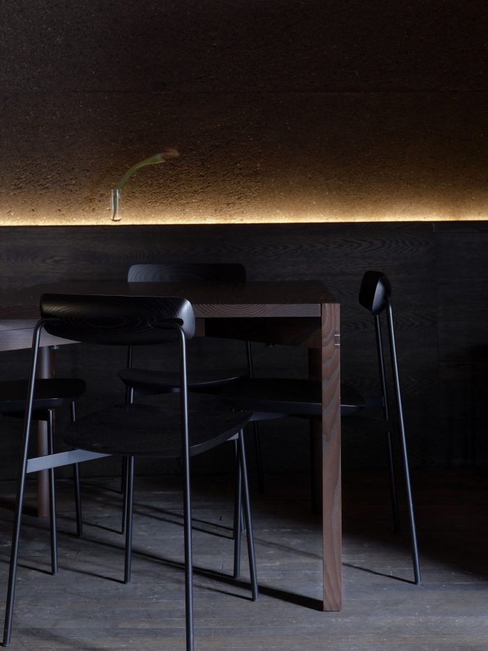 该场所的偏移墙与倾斜的酒吧平行,其周围有舒适的长椅,由Kvadrat/Raf Simons的深蓝色和黑色格子图案织物制成。围绕着空间的深色木材细木工制品,定制的红雪松雕刻灯--其弯曲的轴模仿了各种蒸馏器的轮廓--装有手工染色的亚麻灯罩,为周围注入温和的光芒。沿着后墙,细木工制品变成了一条由起伏的木桌组成的情绪化小巷。它被称为 "火柴巷",是舒适的二人空间。在墙壁之间(以及酒吧的入口门旁边),玻璃面的木制壁龛艺术性地展示了招牌商品和季节性的易腐物品,加强了品牌激活。