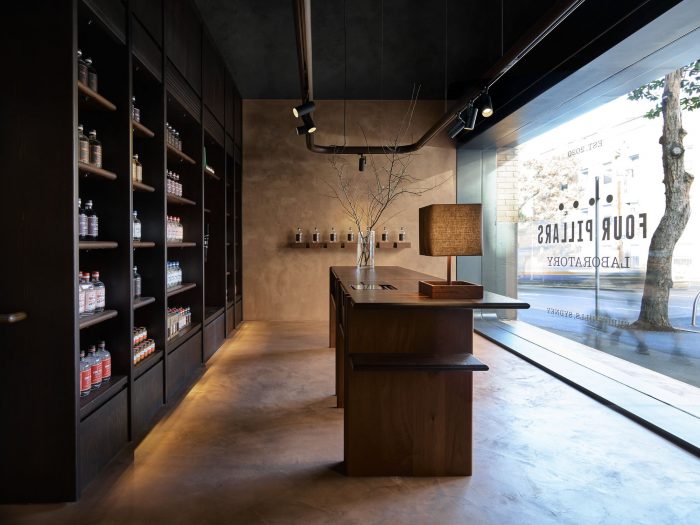 Carved from rare Australian Red Cedar stumps, the POS possesses discretionary compartments to minimise transactional devices, with shelves beneath to layer merchandise. Other inspired quirks include grooved solid timber blocks securing a range of gin bottles that can be removed from their metal rail base and placed on the POS for tasting sessions, instantly converting the store to a cellar door. A custom- sculpted halo of Cambia Ash concealing track lighting hovers above, igniting interest in the Gin Lab aloft. Micro-cement rendered walls and floors with a Pandomo finish add rustic warmth whilst nodding to the brand’s copper-toned logo.