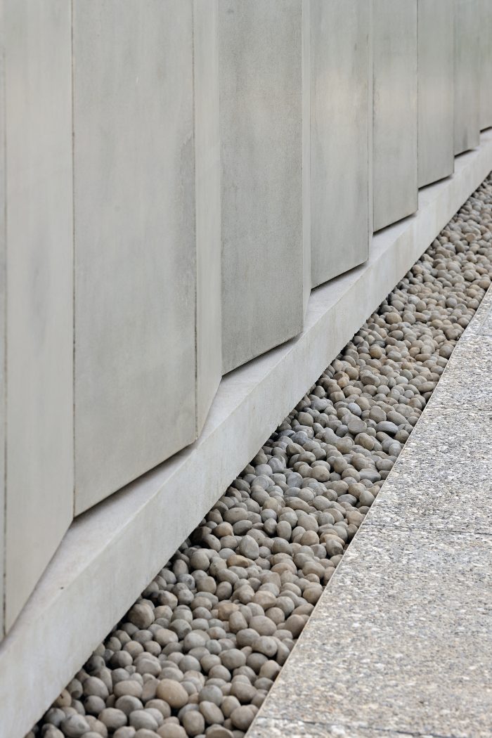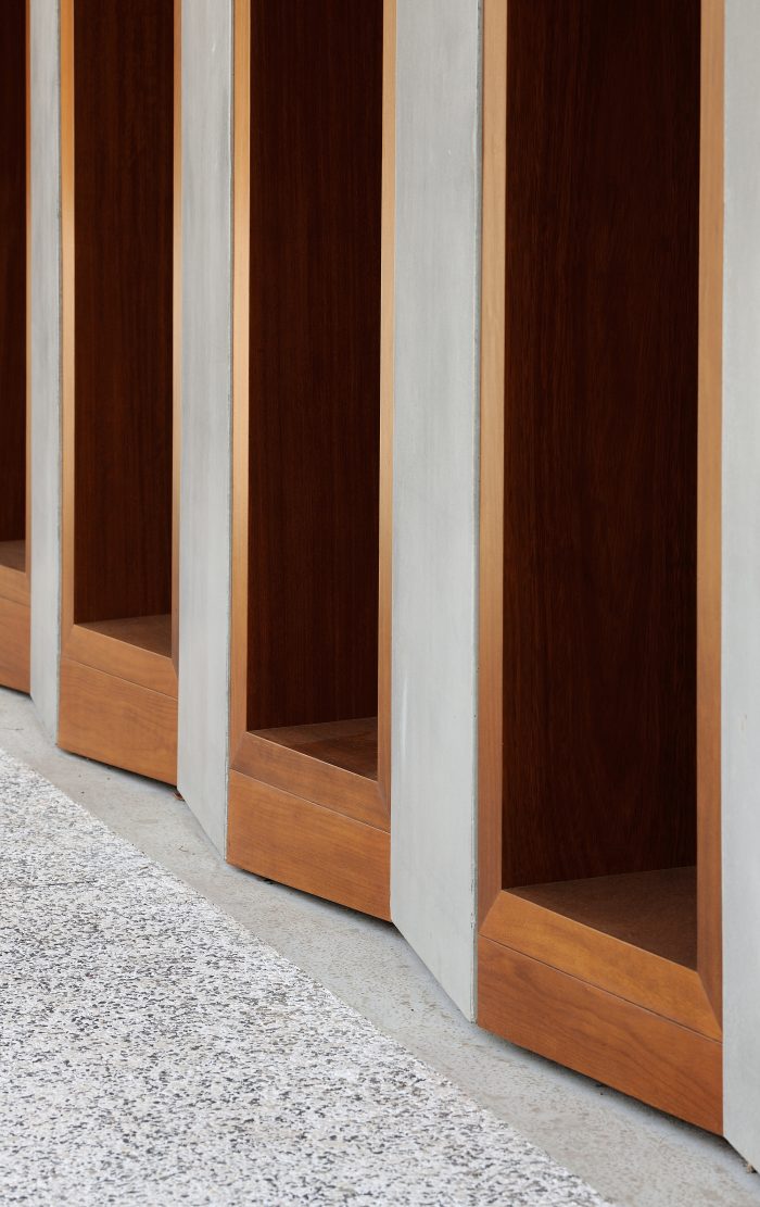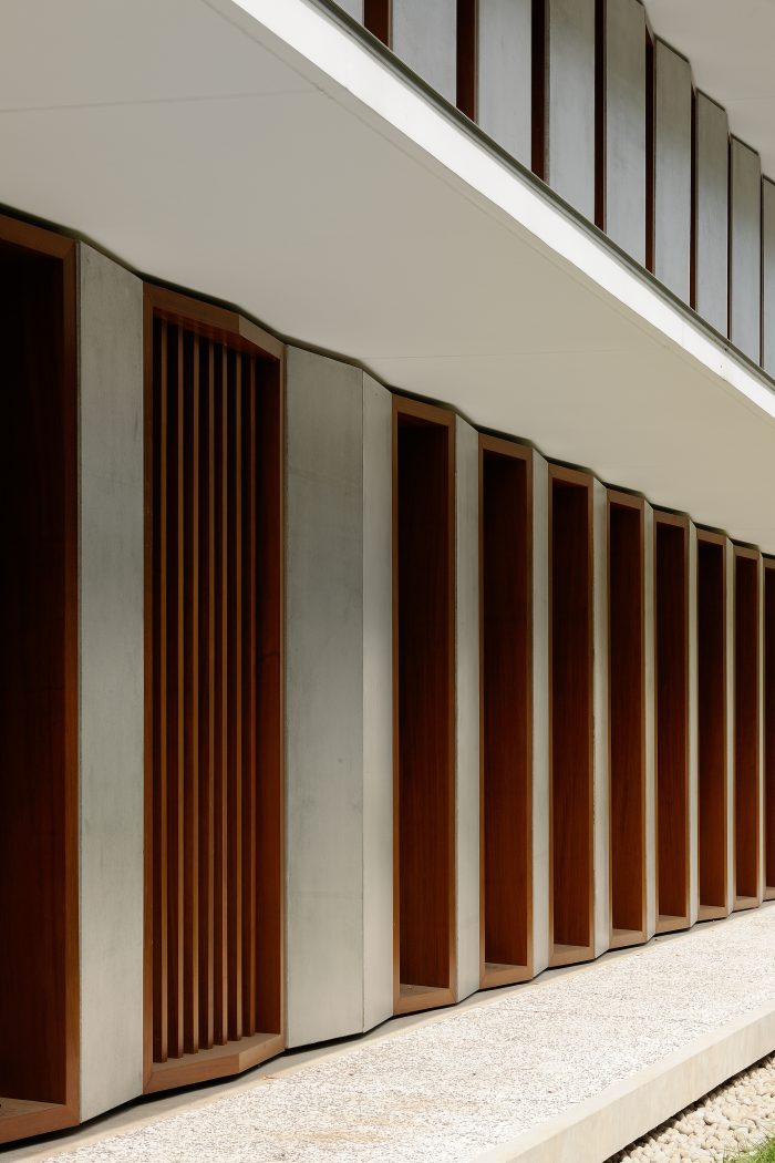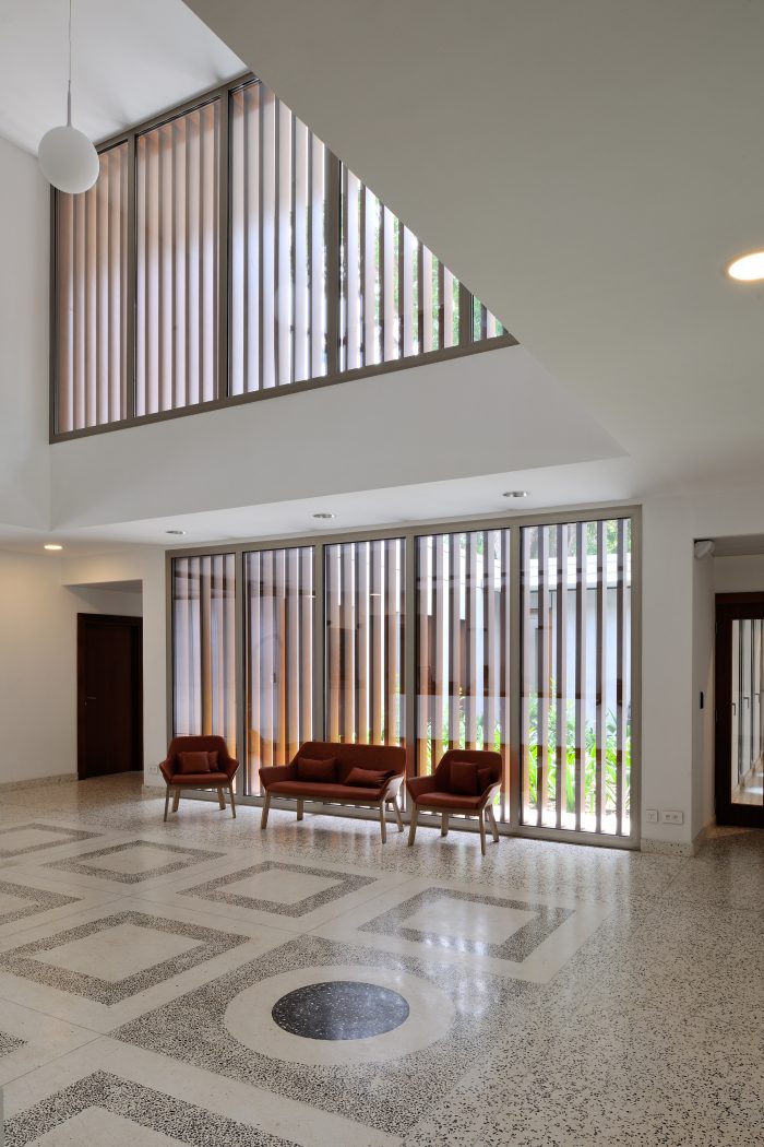 The smooth, shiny and ingeniously folded facade reflects its environment and reacts to the natural light, changing the facade colors along the day. The external insulation is covered by prefabricated concrete panels and the windows joinery is made of local iroko wood. The inside floor is all made of terrazzo. The double-height space of the reception is emphasized by the geometrical pattern of the terrazzo floor.