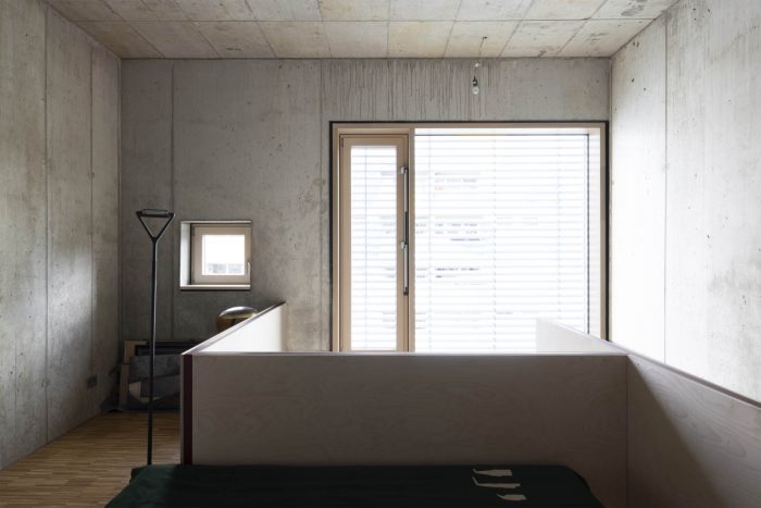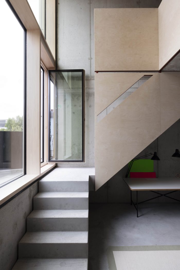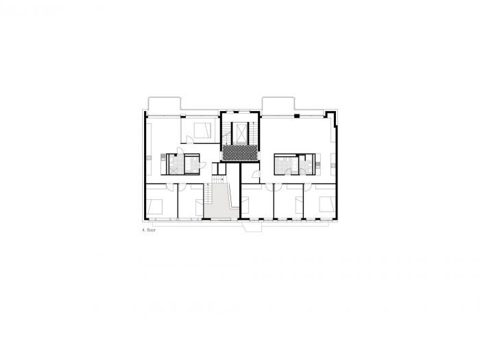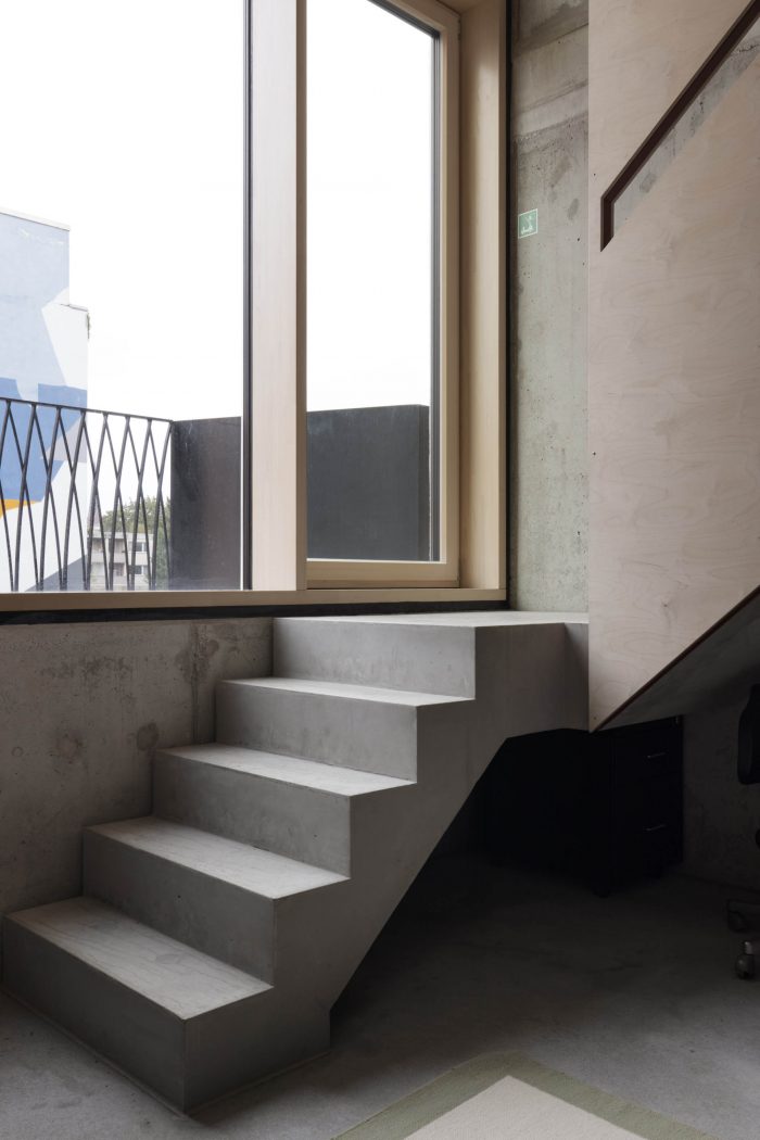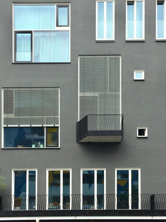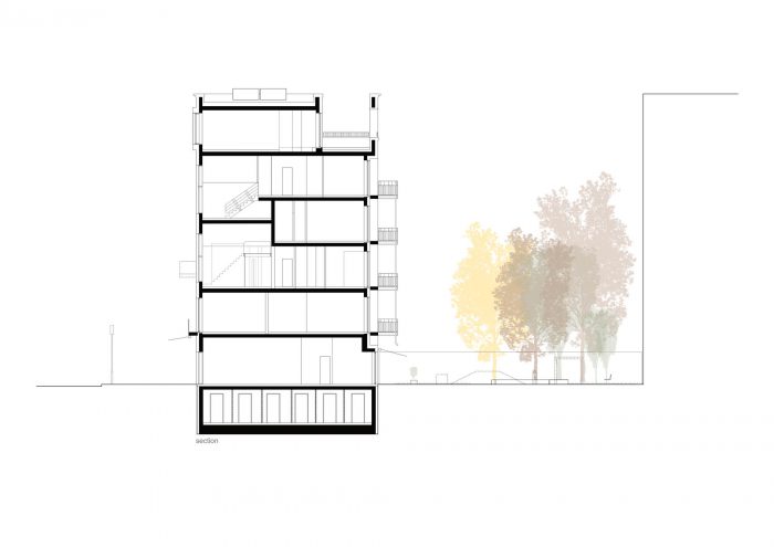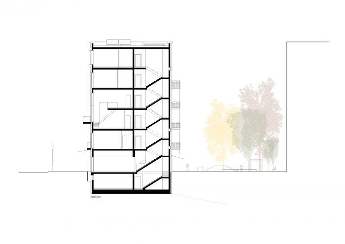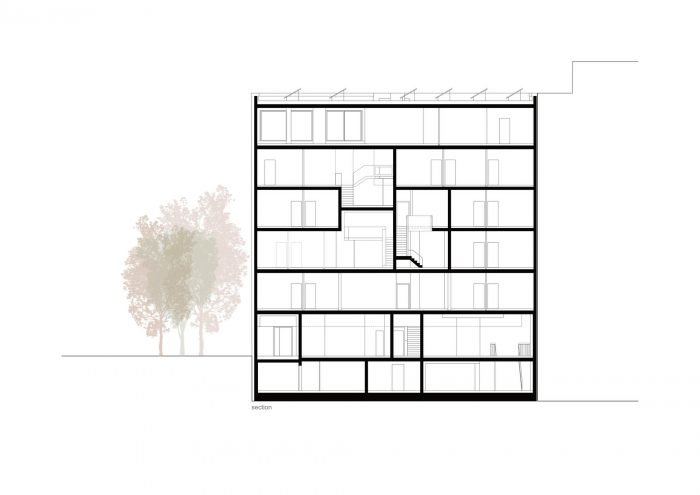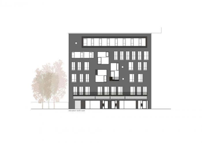 Unlike the Belle Etage of a Paris House, the first floor has the standard 3,10m room height, but its special relation to the street is prescribed by the delicate and continuous railing. The window composition to the street describes the internal layout where three apartments break out of the standard, but generous 3,10m room height to 4,80m and 6,50m. The grey facade has therefore aspirations to be read as a palazzo, with the projecting penthouse window playing the classic Attica.