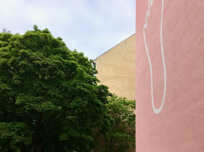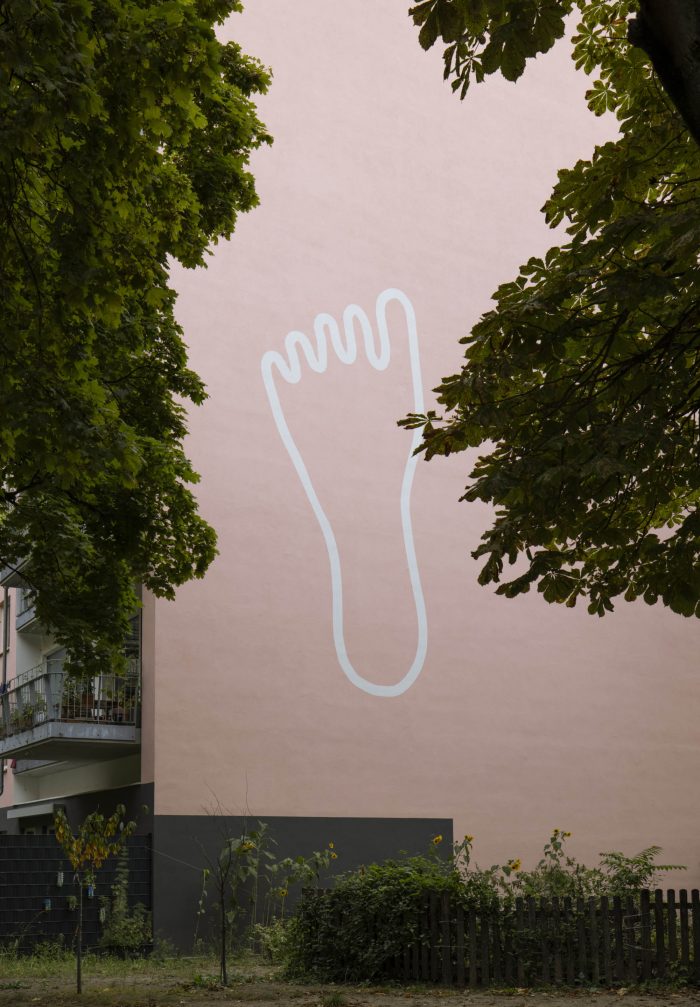 The well-behaved chorus anticipates a fictive future block-perimeter conclusion to the south, where there is now a Kindergarten (with luxurious trees). Here the pink sidewall (firewall) presents itself to the kids with its giant footprint graphic.