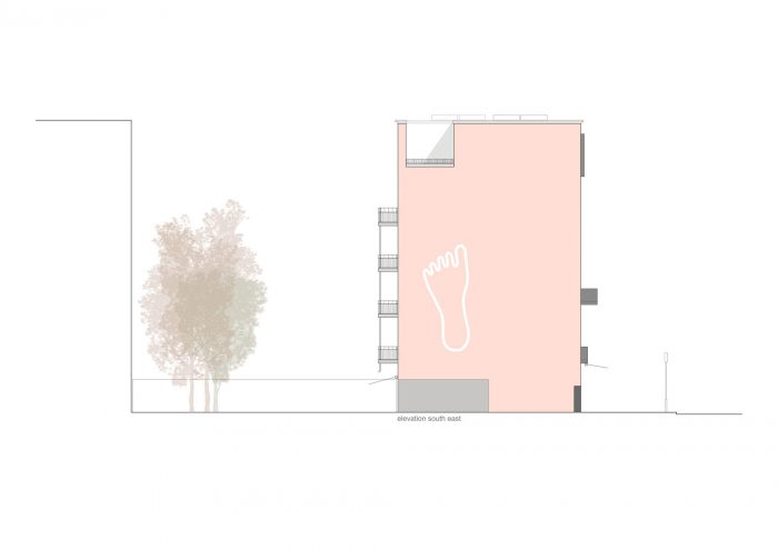 乖巧的合唱预示着未来街区周边的假想结论,在南部,现在有一个幼儿园(有豪华的树木)。在这里,粉红色的侧墙(防火墙)以其巨大的脚印图形向孩子们展示了自己。