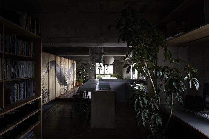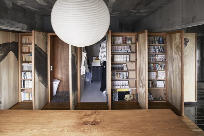 Considering the use of the space as a home and office, clearly dividing the limited area of 80 square meters into two halves would limit the range of activities of the residents/workers. As a result of the search for a plan that maximizes the overlap between "living" and "working," it became the single room that is loosely connected from the office space to the bedroom. Since the majority of the room acts as an office, we did not want to actively show elements that would give the impression of daily life (bathroom, toilet, walk-in closet, novels and comics, etc.). As a result of placing them on the side of the wall without a window, a series of nine fittings that traverse the room appeared. Those nine fittings are a set of practical doors separating public and private spaces, but also look like a horizontal screen with a ratio of 4:1 that traverses the room as a whole. How should we handle this screen?