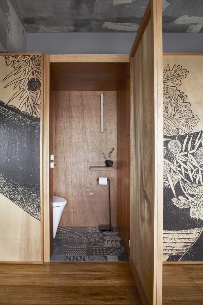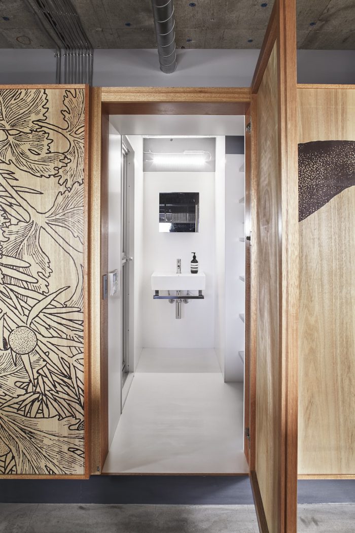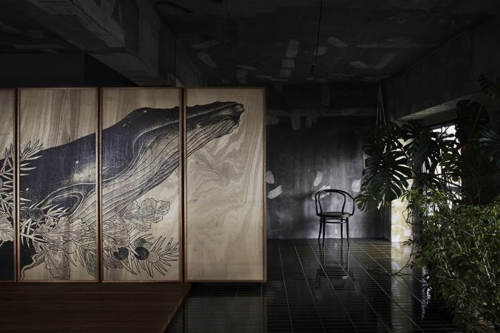We decided to use a whale as a motif of the painting, because of our interests in a scale far removed from human living space and its combination with the canal, and asked the artist, Saki Ikeda, to design the fusuma. The original drawing, about 40 cm wide and meticulously drawn with a drawing pen, was enlarged and printed directly on lauan plywood using a special large-scale printer. The lauan selected at a warehouse in Shin-Kiba was rough in grain and color, which is not usually appreciated for use in the normal field, however, here the rough grain of the wood was used to express the waves.
