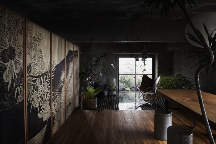 当人们面对长谷川东学的《松树》屏风时,感觉自己就像站在画里的雾气空间里。屏障画,如fusuma-e(滑动门画)和byobu-e(折叠屏风画),可以创造出与xyz轴不同的 "非相位深度",这取决于它们的大小以及所描绘的场景与观众的想象力之间的互动。我们认为,日本的障画文化随着其发展有一个获得增强现实深度感的方面,人们的想象力在空间中来回移动。在这里,上述的九个连续的配件被当作扶桑画的画布。我们想在城市里的公寓房间的混凝土盒子里创造一个新的深度。