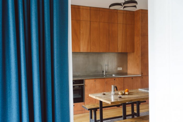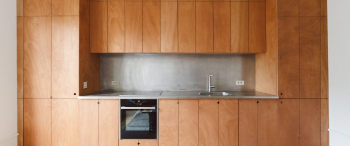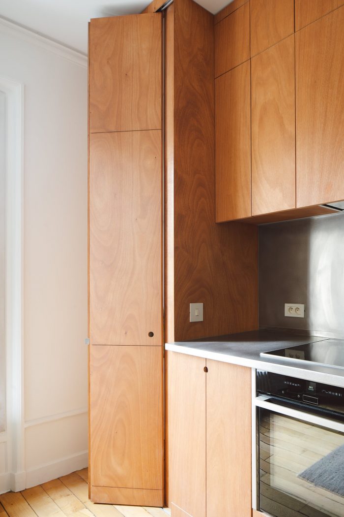 The new composition is made of depths of field. So many backstage and stage spaces, more than serving spaces / served spaces. This new organization of domestic spaces is constructed by the punctual positioning of multifunctional furniture in oiled okoume wood and brushed aluminum.