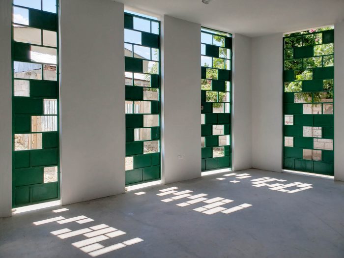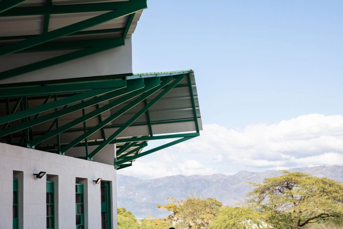 The building emerged from carefully studying and combining the only affordable materials - CMU block, concrete, and corrugated steel roofing - in order to increase airflow, provide natural light and security, and control sound transmission between classrooms. The facade's rhythm of reinforced piers and openings, which is a big part of the school's identity, is based on playfully shifting the CMU block piers which transfer the bearing, up-lift, and shear loads down to the foundations.