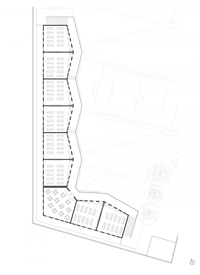 The proposed site strategy consists of a courtyard scheme made up of an L-shaped classroom building and an administrative building that dovetail with the existing trees in order to provide light-filled, naturally-ventilated classrooms surrounding a large open central space for the kids to play. This configuration was a direct response to the needs of the administration: to be able to provide a safe, healthy space for the children that fosters community.