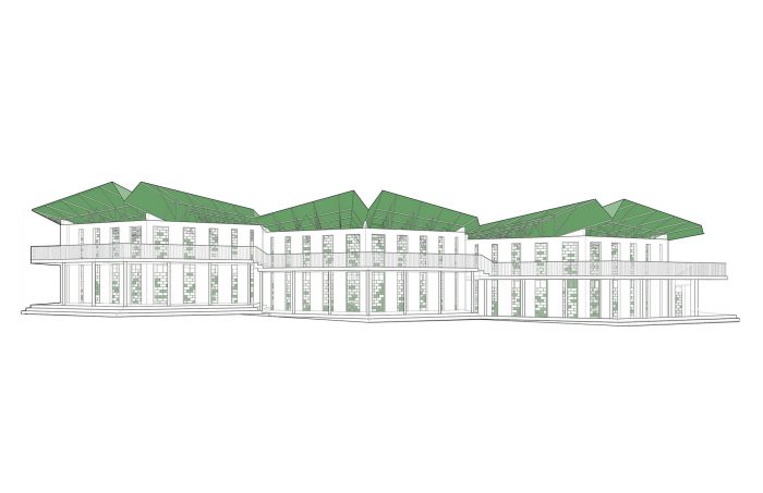 该建筑是通过仔细研究并结合唯一负担得起的材料--CMU砌块、混凝土和波纹钢屋顶--以增加空气流动,提供自然光和安全,并控制教室之间的声音传播而出现的。 外墙的加固墩和开口的节奏是学校特征的重要组成部分,它是基于俏皮地移动CMU块的墩子,这些墩子将承重、向上提升和剪切载荷转移到地基上。
