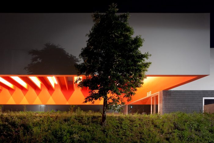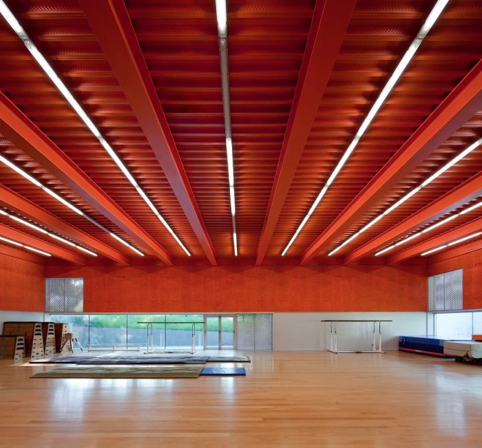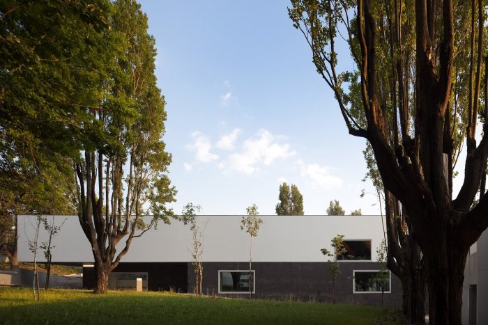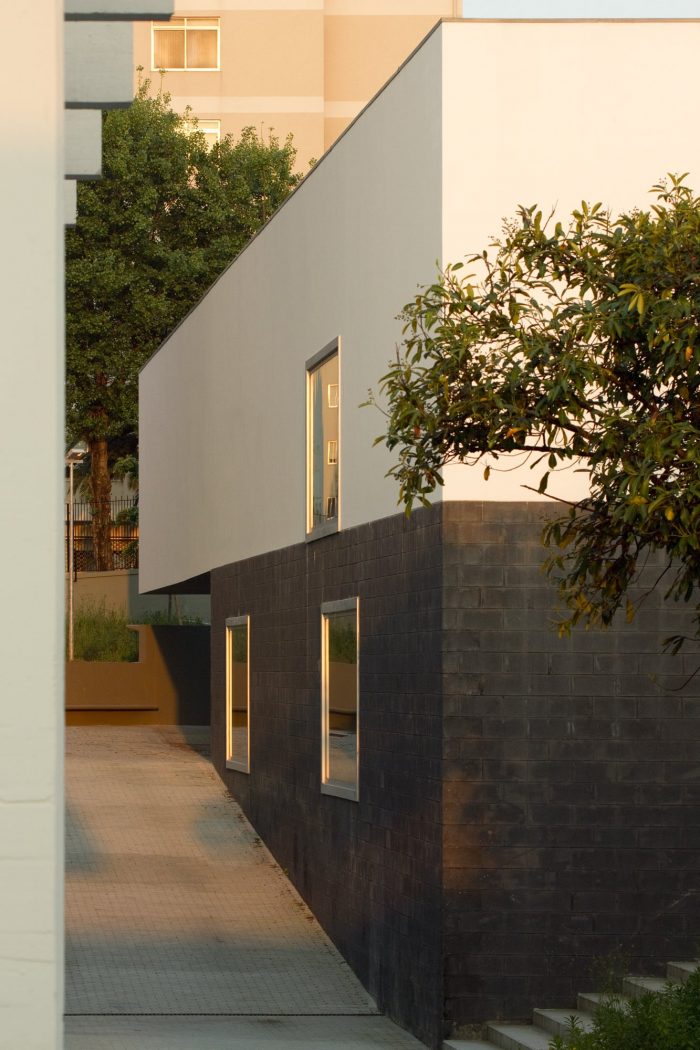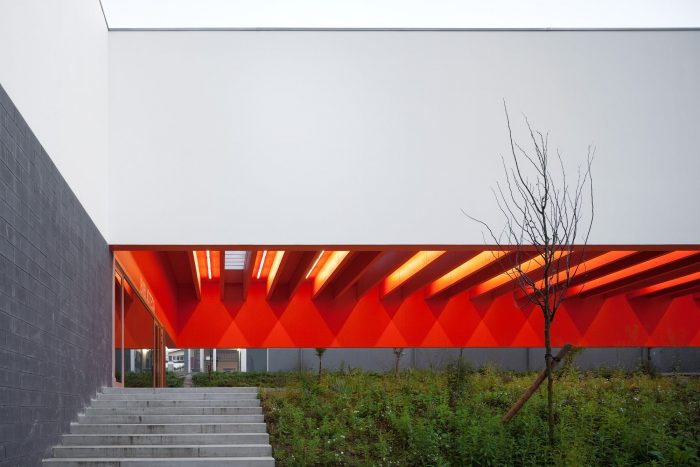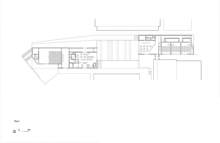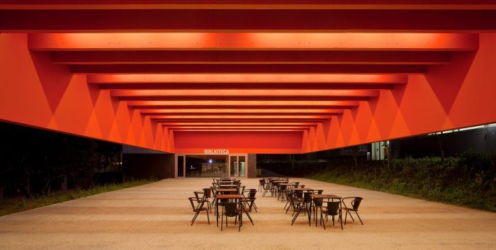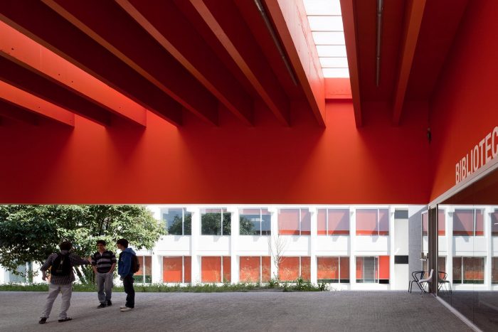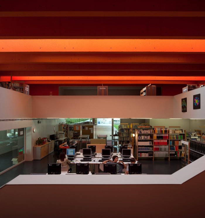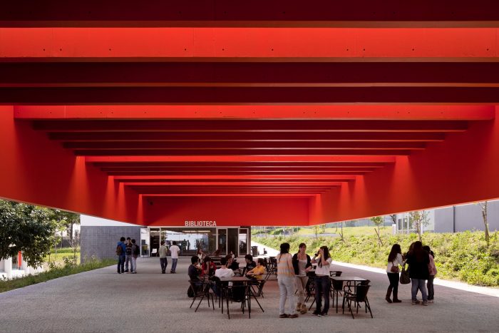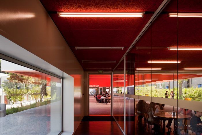The building is linear, and opening onto the covered area are two of the most dynamic parts of the school: the library and the cafeteria. It is located in the space between the existing buildings and, suggesting dislocation this led to a roof design for the open area that appears to be unstable and not supported. Strong colours in the new environments contrast neutrality of the classrooms, and the greatest intensity is in the great covered “square”.